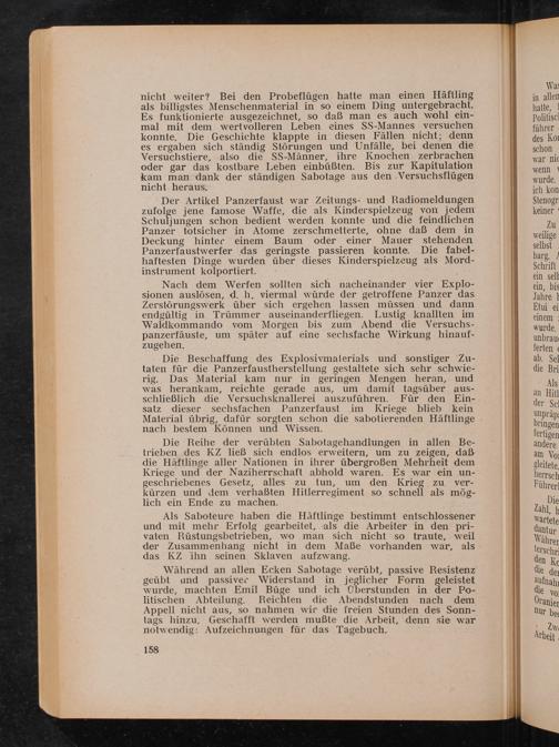 Die Reihe der verübten Sabotagehandlungen in allen Betrieben des KZ ließ sich endlos erweitern, um zu zeigen, daß die Häftlinge aller Nationen in ihrer übergroßen Mehrheit dem Kriege und der Naziherrschaft abhold waren. Es war ein ungeschriebenes Gesetz, alles zu tun, um den Krieg zu verkürzen und dem verhaßten Hitlerregiment so schnell als möglich ein Ende zu machen.