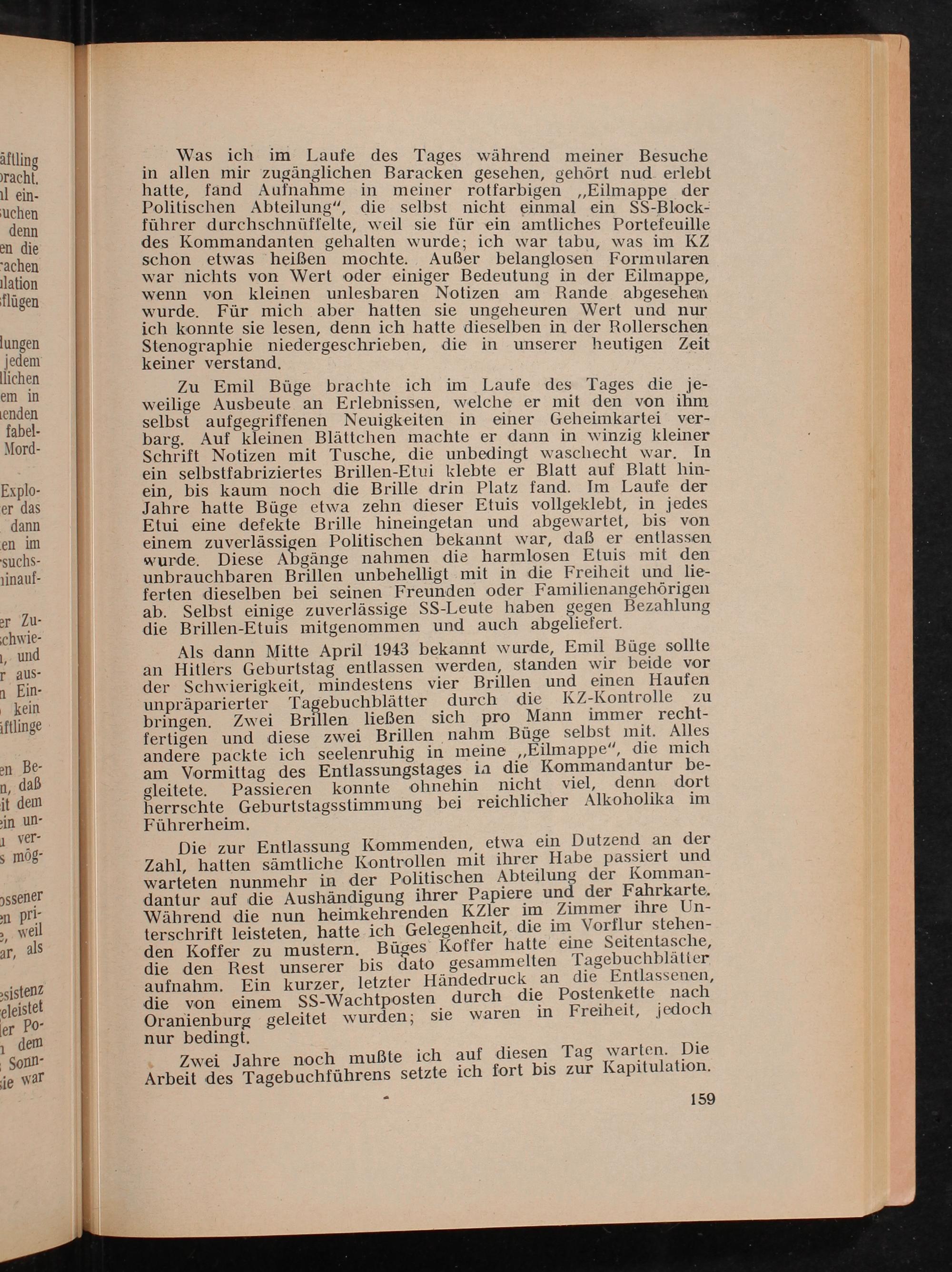Als dann Mitte April 1943 bekannt wurde, Emil Büge sollte an Hitlers Geburtstag entlassen werden, standen wir beide vor der Schwierigkeit, mindestens vier Brillen und einen Haufen unpräparierter Tagebuchblätter durch die KZ-Kontrolle zu bringen. Zwei Brillen ließen sich pro Mann immer recht- fertigen und diese zwei Brillen nahm Büge selbst mit. Alles andere packte ich seelenruhig in meine„Eilmappe“, die mich am Vormittag des Entlassungstages ia die Kommandantur be- gleitete.e. Passieren konnte ohnehin nicht viel, denn dort herrschte Geburtstagsstimmung bei reichlicher Alkoholika im Führerheim.