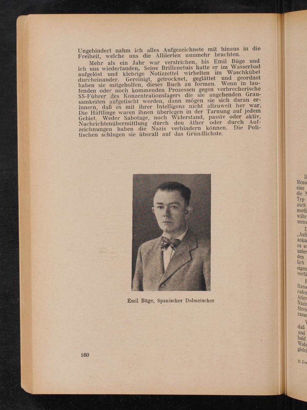 Mehr als ein Jahr war verstrichen, bis Emil Büge und ich uns wiederfanden. Seine Brillenetuis hatte er im Wasserbad aufgelöst und klebrige Notizzettel wirbelten im Waschkübel durcheinander. Gereinigt, getrocknet, geglättet und geordnet haben sie mitgeholfen, dieses Buch zu formen. Wenn in laufenden oder noch kommenden Prozessen gegen verbrecherische SS - Führer des Konzentrationslagers die sie angehenden Grausamkeiten aufgetischt werden, dann mögen sie sich daran erinnern, daß es mit ihrer Intelligenz nicht allzuweit her war. Die Häftlinge waren ihnen überlegen in der Tarnung auf jedem Gebiet. Weder Sabotage, noch Widerstand, passiv oder aktiv, Nachrichtenübermittlung durch den Äther oder durch Aufzeichnungen haben die Nazis verhindern können. tischen schlugen sie überall auf das Gründlichste.