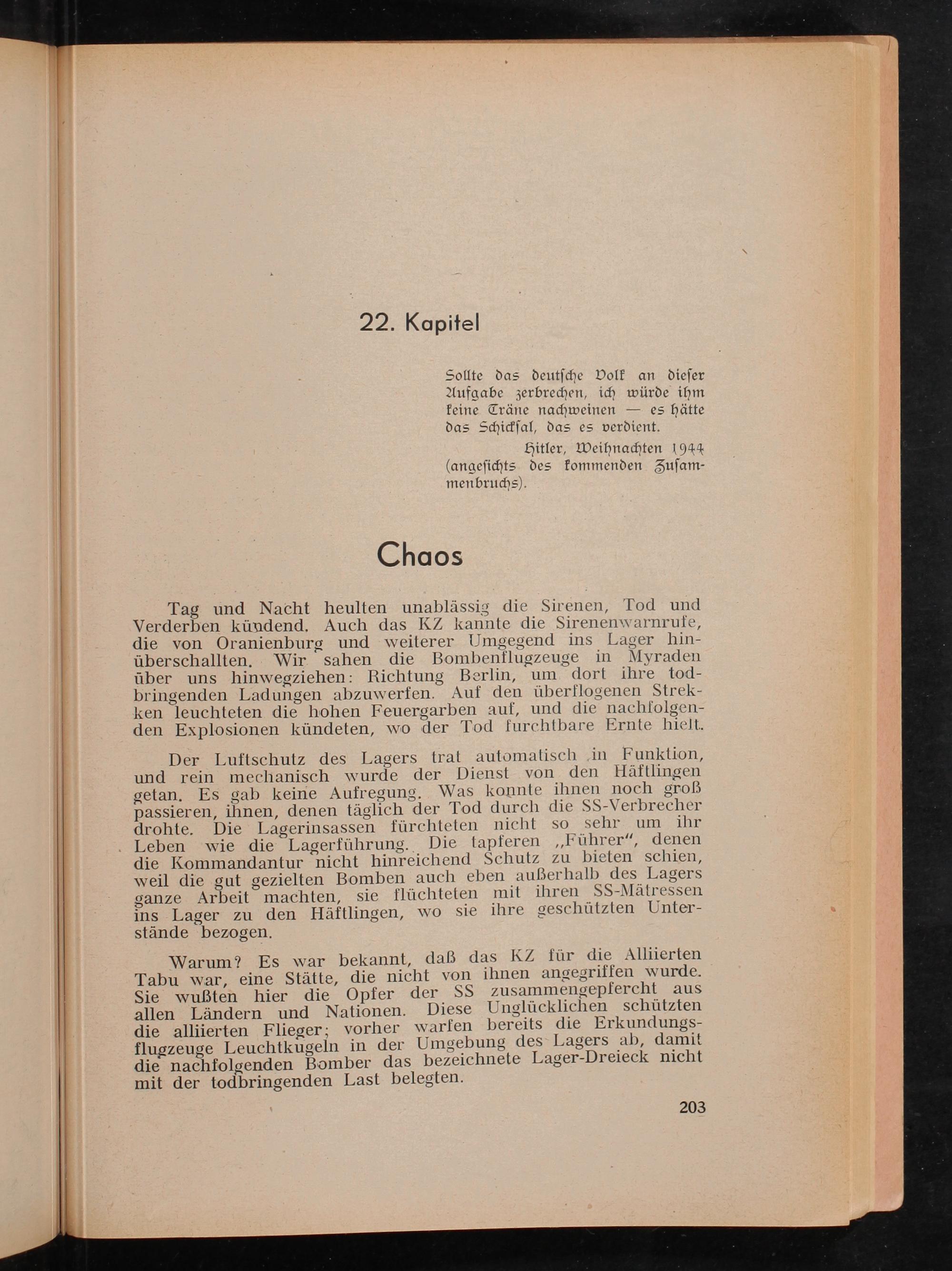 Warum? Es war bekannt, daß das KZ für die Alliierten Tabu war, eine Stätte, die nicht von ihnen angegriffen wurde. Sie wußten hier die Opfer der SS zusammengepfercht aus allen Ländern und Nationen. Diese Unglücklichen schützten die alliierten Flieger; vorher warfen bereits die Erkundungsflugzeuge Leuchtkugeln in der Umgebung des Lagers ab, damit die nachfolgenden Bomber das bezeichnete Lager- Dreieck nicht mit der todbringenden Last belegten.