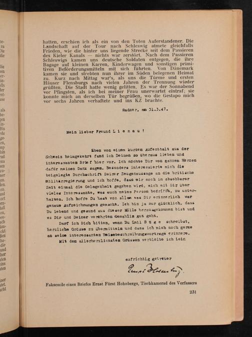 Eben von einem kurzen Aufenthalt aus der Schweiz heimgekehrt fand ich Deinen so übe raus lieben und interessenten Bref hier vor. Ich möchte Dir von ganzem Herzen dafür meinen Dank gagen. Besonders interessierte mich die beigelegte Durchschrift Deiner Zeugenaussage an die britische Militärregierung und ich hoffe, dass mir noch in absehbarer Zeit eirmel die Gelegenheit gegeben wird, mich mit Dir über vieles Interessante, was euch meine Person begririk, zu untar- harten. Ich hofre Du hast von allen was Dir erinnerlich wer genaue Aufzeichnungen ganacht. ieh bin ja nur glücklich, dass Du lebend und gesund aus dieser Wölle herausgekonmen bist und es Dir und Deiner verehrten Gemahlin gut geht.
