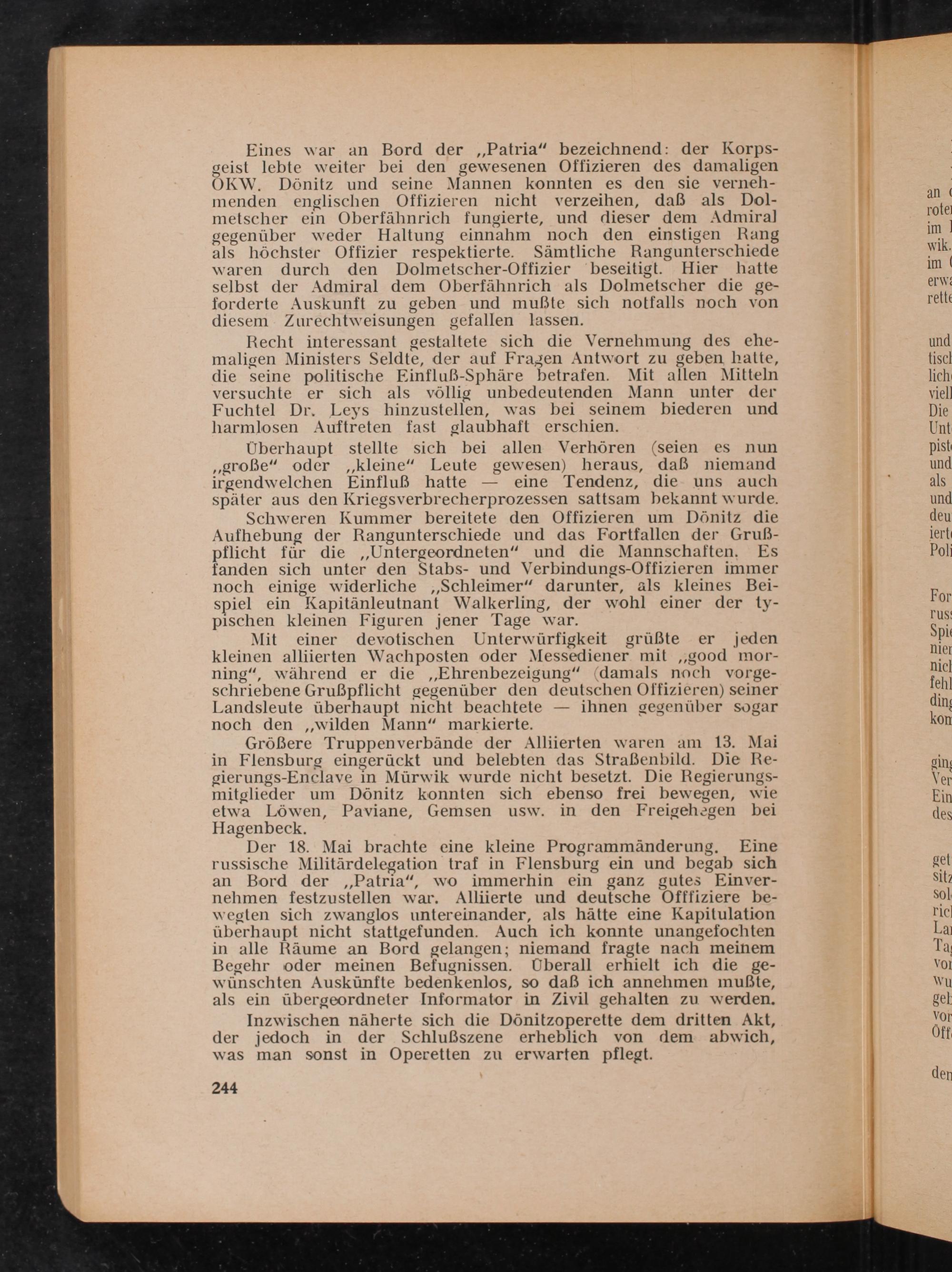 Der 18. Mai brachte eine kleine Programmänderung. russische Militärdelegation traf in Flensburg ein und begab sich an Bord der ,, Patria", wo immerhin ein ganz gutes Einvernehmen festzustellen war. Alliierte und deutsche Offfiziere bewegten sich zwanglos untereinander, als hätte eine Kapitulation überhaupt nicht stattgefunden. Auch ich konnte unangefochten in alle Räume an Bord gelangen; niemand fragte nach meinem Begehr oder meinen Befugnissen. Überall erhielt ich die gewünschten Auskünfte bedenkenlos, so daß ich annehmen mußte, als ein übergeordneter Informator in Zivil gehalten zu werden. Inzwischen näherte sich die Dönitzoperette dem dritten Akt, der jedoch in der Schlußszene erheblich von dem abwich, was man sonst in Operetten zu erwarten pflegt.