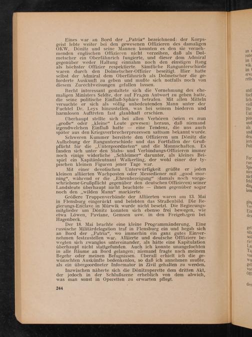Eines war an Bord der ,, Patria" bezeichnend: der Korpsgeist lebte weiter bei den gewesenen Offizieren des damaligen OKW. Dönitz und seine Mannen konnten es den sie vernehmenden englischen Offizieren nicht verzeihen, daß als Dolmetscher ein Oberfähnrich fungierte, und dieser dem Admiral gegenüber weder Haltung einnahm noch den einstigen Rang als höchster Offizier respektierte. Sämtliche Rangunterschiede waren durch den Dolmetscher- Offizier beseitigt. Hier hatte selbst der Admiral dem Oberfähnrich als Dolmetscher die geforderte Auskunft zu geben und mußte sich notfalls noch von diesem Zurechtweisungen gefallen lassen.