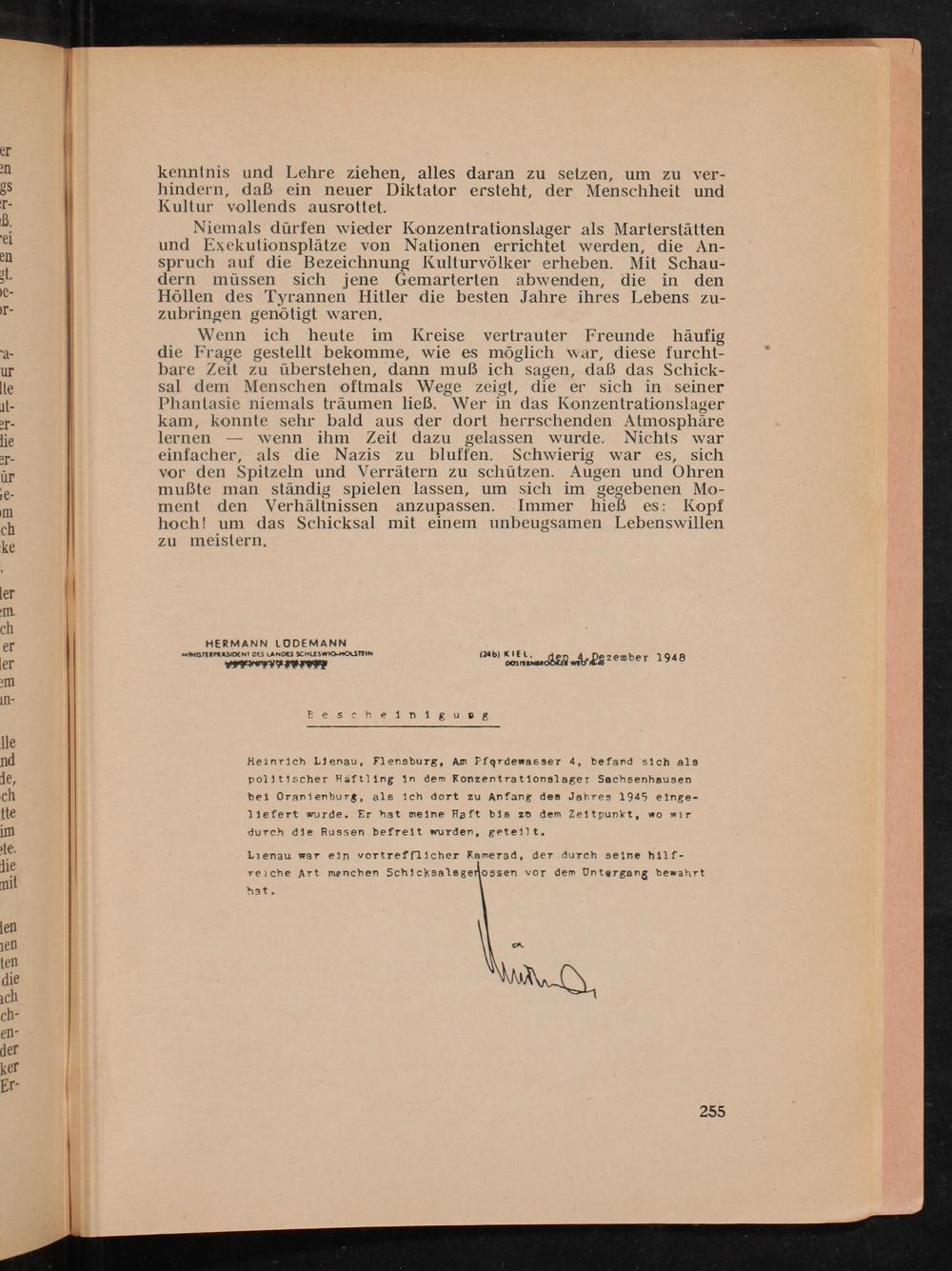 Heinrich Lienau, Flensburg , Am Pfgrdewasser 4, befand sich als politischer Häftling in dem Konzentrationslager Sachsenhausen bei Oranienburg , als ich dort zu Anfang des Jahres 1945 einge- liefert wurde.. Er hat meine Haft bis zb dem Zeitpunkt, wo wir durch die Russen befreit wurden, geteilt.