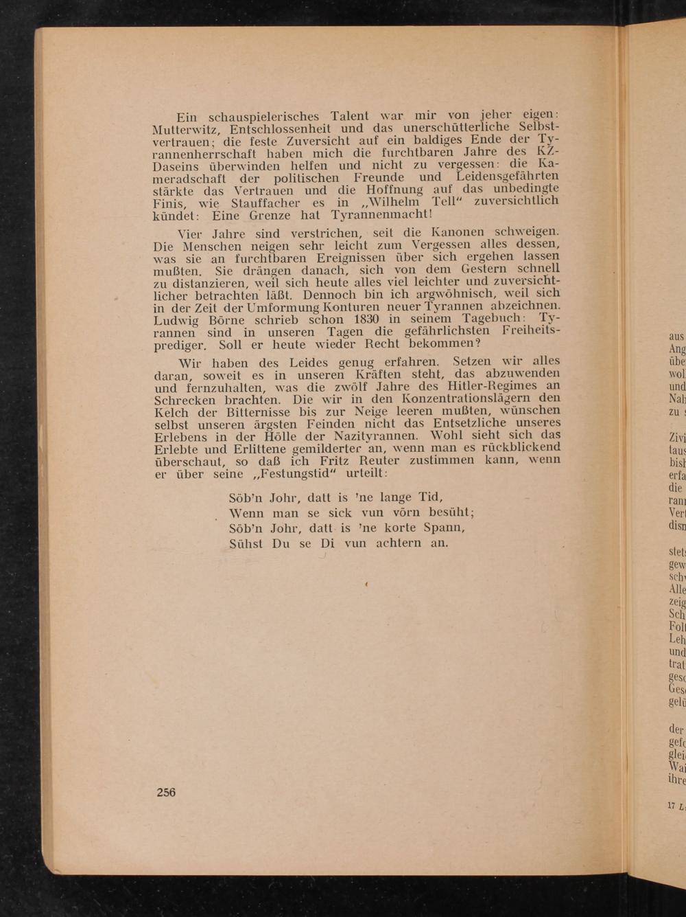 Ein schauspielerisches Talent war mir von jeher eigen: Mutterwitz, Entschlossenheit und das unerschütterliche Selbstvertrauen; die feste Zuversicht auf ein baldiges Ende der Tyrannenherrschaft haben mich die furchtbaren Jahre des KZDaseins überwinden helfen und nicht zu vergessen: die Kameradschaft der politischen Freunde und Leidensgefährten stärkte das Vertrauen und die Hoffnung auf das unbedingte Finis, wie Stauffacher es in ,, Wilhelm Tell " zuversichtlich kündet: Eine Grenze hat Tyrannenmacht!