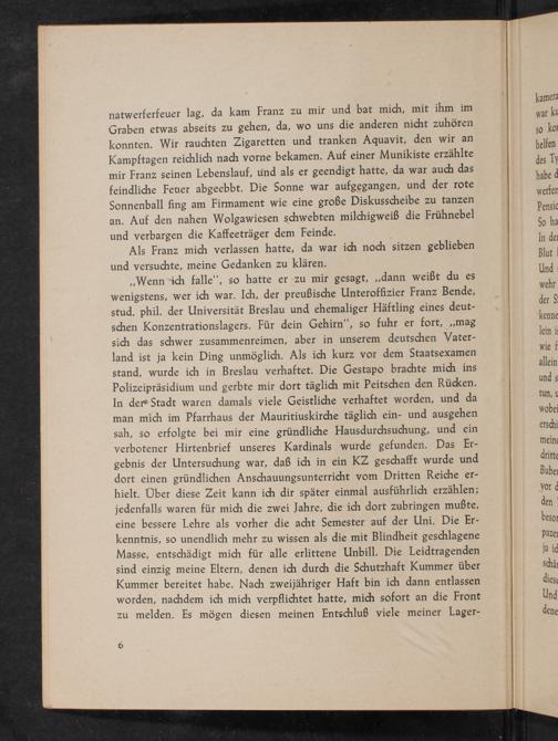 ‚Wenn ich falle“, so hatte er zu mir gesagt,„dann weißt du es wenigstens, wer ich war. Ich, der preußische Unteroffizier Franz Bende, stud. phil. der Universität Breslau und ehemaliger Häftling eines deut- schen Konzentrationslagers. Für dein Gehirn“, so fuhr er fort,„mag sich das schwer zusammenreimen, aber in unserem deutschen Vater- land ist ja kein Ding unmöglich. Als ich kurz vor dem Staatsexamen stand, wurde ich in Breslau verhaftet. Die Gestapo brachte mich ins Polizeipräsidium und gerbte mir dort täglich mit Peitschen den Rücken. In dere Stadt waren damals viele Geistliche verhaftet worden, und da man mich im Pfarrhaus der Mauritiuskirche täglich ein- und ausgehen sah, so erfolgte bei mir eine gründliche Hausdurchsuchung, und ein verbotener Hirtenbrief unseres Kardinals wurde gefunden. Das Er- gebnis der Untersuchung war, daß ich in ein KZ geschafft wurde und dort einen gründlichen Anschauungsunterricht vom Dritten Reiche er- hielt. Über diese Zeit kann ich dir später einmal ausführlich erzählen; jedenfalls waren für mich die zwei Jahre, die ich dort zubringen mußte, eine bessere Lehre als vorher die acht Semester auf der Uni. Die Er- kenntnis, so unendlich mehr zu wissen als die mit Blindheit geschlagene Masse, entschädigt mich für alle erlittene Unbill. Die Leidtragenden sind einzig meine Eltern, denen ich durch die Schutzhaft Kummer über Kummer bereitet habe. Nach zweijähriger Haft bin ich dann entlassen worden, nachdem ich mich verpflichtet hatte, mich sofort an die Front zu melden. Es mögen diesen meinen Entschluß viele meiner Lager-