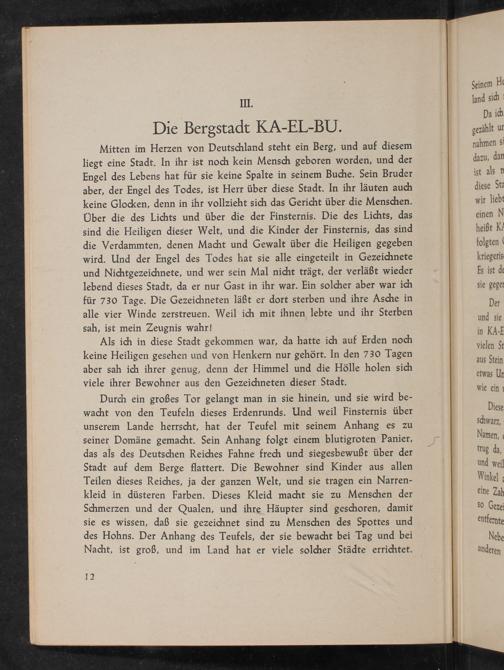 Durch ein großes Tor gelangt man in sie hinein, und sie wird be- wacht von den Teufeln dieses Erdenrunds. Und weil Finsternis über unserem Lande herrscht, hat der Teufel mit seinem Anhang es zu seiner Domäne gemacht. Sein Anhang folgt einem blutigroten Panier, das als des Deutschen Reiches Fahne frech und siegesbewußt über der Stadt auf dem Berge flattert. Die Bewohner sind Kinder aus allen Teilen dieses Reiches, ja der ganzen Welt, und sie tragen ein Narren- kleid in düsteren Farben. Dieses Kleid macht sie zu Menschen der Schmerzen und der Qualen, und ihre Häupter sind geschoren, damit sie es wissen, daß sie gezeichnet sind zu Menschen des Spottes und des Hohns. Der Anhang des Teufels, der sie bewacht bei Tag und bei Nacht, ist groß, und im Land hat er viele solcher Städte errichtet.