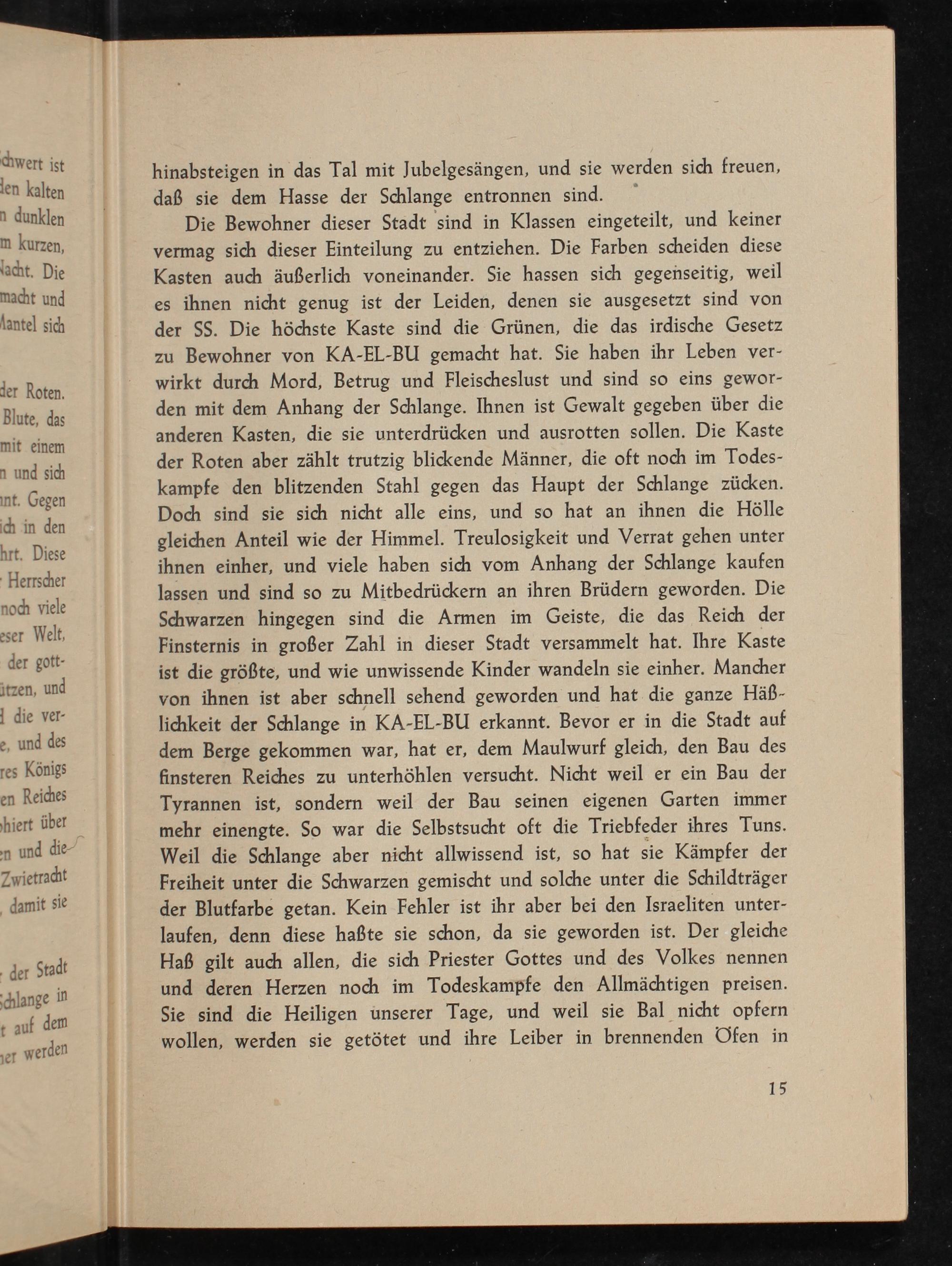 Die Bewohner dieser Stadt sind in Klassen eingeteilt, und keiner vermag sich dieser Einteilung zu entziehen. Die Farben scheiden diese Kasten auch äußerlich voneinander. Sie hassen sich gegenseitig, weil es ihnen nicht genug ist der Leiden, denen sie ausgesetzt sind von der SS. Die höchste Kaste sind die Grünen, die das irdische Gesetz zu Bewohner von KA-EL-BU gemacht hat. Sie haben ihr Leben ver- wirkt durch Mord, Betrug und Fleischeslust und sind so eins gewor- den mit dem Anhang der Schlange. Ihnen ist Gewalt gegeben über die anderen Kasten, die sie unterdrücken und ausrotten sollen. Die Kaste der Roten aber zählt trutzig blickende Männer, die oft noch im Todes- kampfe den blitzenden Stahl gegen das Haupt der Schlange zücken. Doc sind sie sich nicht alle eins, und so hat an ihnen die Hölle gleichen Anteil wie der Himmel. Treulosigkeit und Verrat gehen unter ihnen einher, und viele haben sich vom Anhang der Schlange kaufen lassen und sind so zu Mitbedrückern an ihren Brüdern geworden. Die Schwarzen hingegen sind die Armen im Geiste, die das Reich der Finsternis in großer Zahl in dieser Stadt versammelt hat. Ihre Kaste ist die größte, und wie unwissende Kinder wandeln sie einher. Mancher von ihnen ist aber schnell sechend geworden und hat die ganze Häß- lichkeit der Schlange in KA-EL-BU erkannt. Bevor er in die Stadt auf dem Berge gekommen war, hat er, dem Maulwurf gleich, den Bau des finsteren Reiches zu unterhöhlen versucht. Nicht weil er ein Bau der Tyrannen ist, sondern weil der Bau seinen eigenen Garten immer mehr einengte. So war die Selbstsucht oft die Triebfeder ihres Tuns. Weil die Schlange aber nicht allwissend ist, so hat sie Kämpfer der Freiheit unter die Schwarzen gemischt und solche unter die Schildträger der Blutfarbe getan. Kein Fehler ist ihr aber bei den Israeliten unter- laufen, denn diese haßte sie schon, da sie geworden ist. Der gleiche Haß gilt auch allen, die sich Priester Gottes und des Volkes nennen und deren Herzen noch im Todeskampfe den Allmächtigen preisen. Sie sind die Heiligen unserer Tage, und weil sie Bal nicht opfern wollen, werden sie getötet und ihre Leiber in brennenden Ofen in