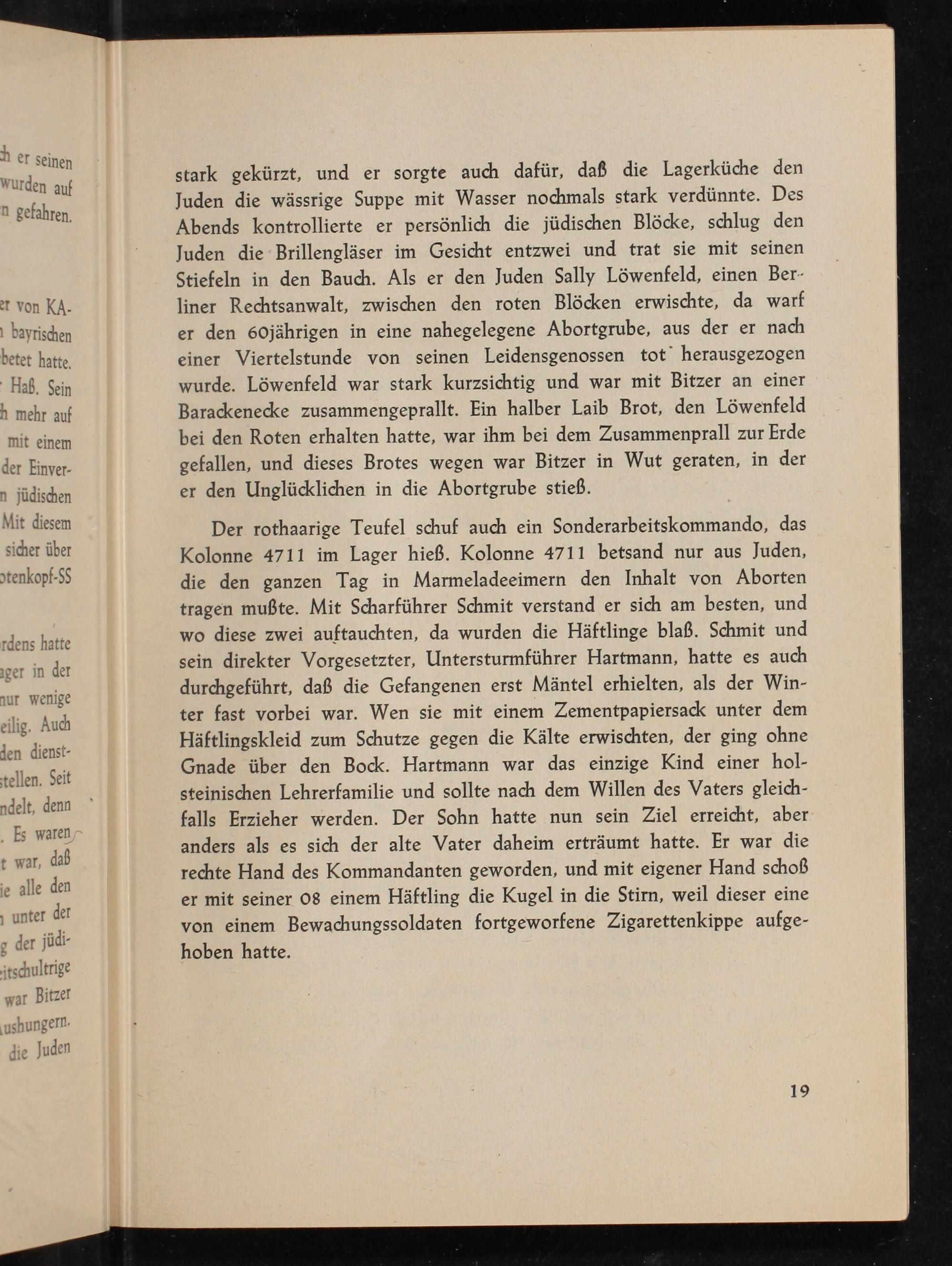 stark gekürzt, und er sorgte auch dafür, daß die Lagerküche den Juden die wässrige Suppe mit Wasser nochmals stark verdünnte. Des Abends kontrollierte er persönlich die jüdischen Blöcke, schlug den Juden die Brillengläser im Gesicht entzwei und trat sie mit seinen Stiefeln in den Bauch. Als er den Juden Sally Löwenfeld, einen Ber liner Rechtsanwalt, zwischen den roten Blöcken erwischte, da warf er den 60jährigen in eine nahegelegene Abortgrube, aus der er nach einer Viertelstunde von seinen Leidensgenossen tot herausgezogen wurde. Löwenfeld war stark kurzsichtig und war mit Bitzer an einer Barackenecke zusammengeprallt. Ein halber Laib Brot, den Löwenfeld bei den Roten erhalten hatte, war ihm bei dem Zusammenprall zur Erde gefallen, und dieses Brotes wegen war Bitzer in Wut geraten, in der er den Unglücklichen in die Abortgrube stieß.
