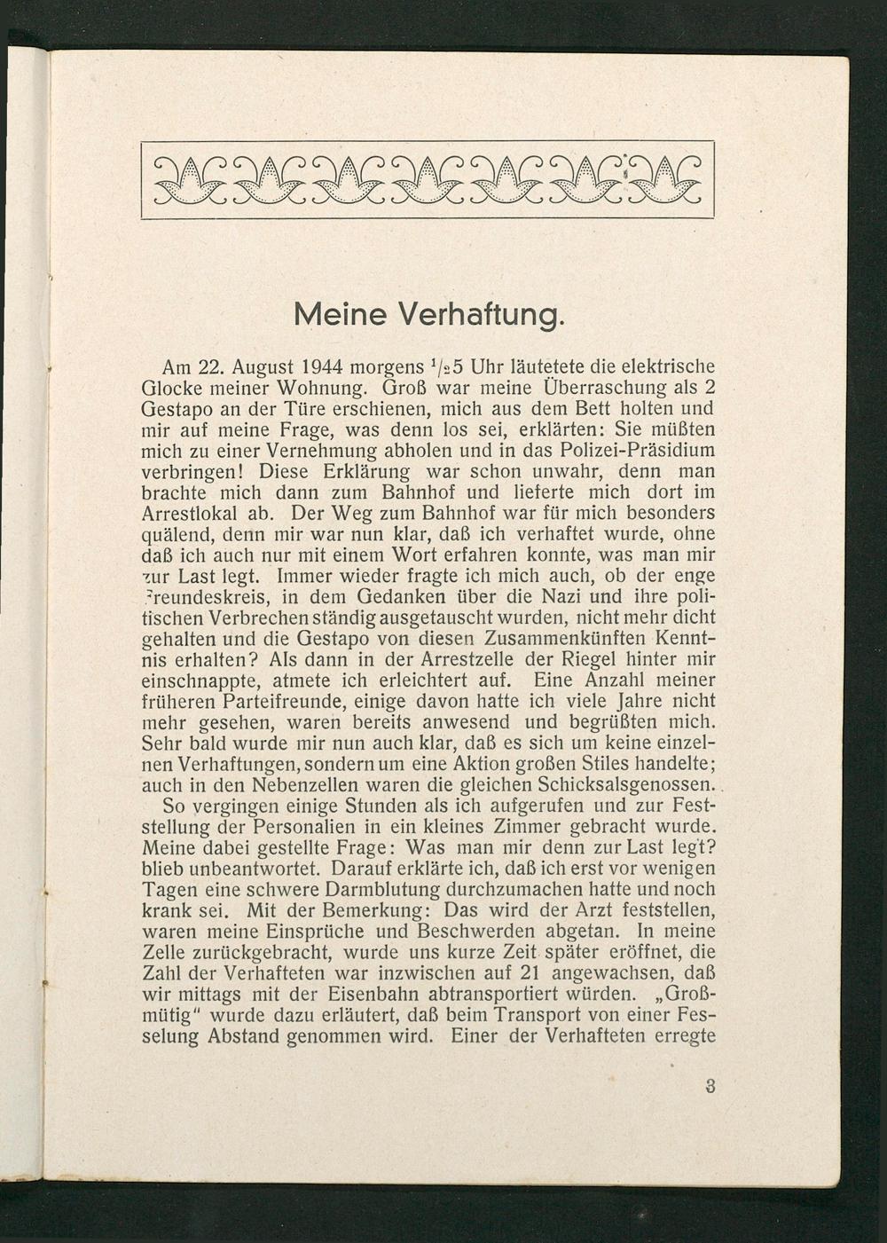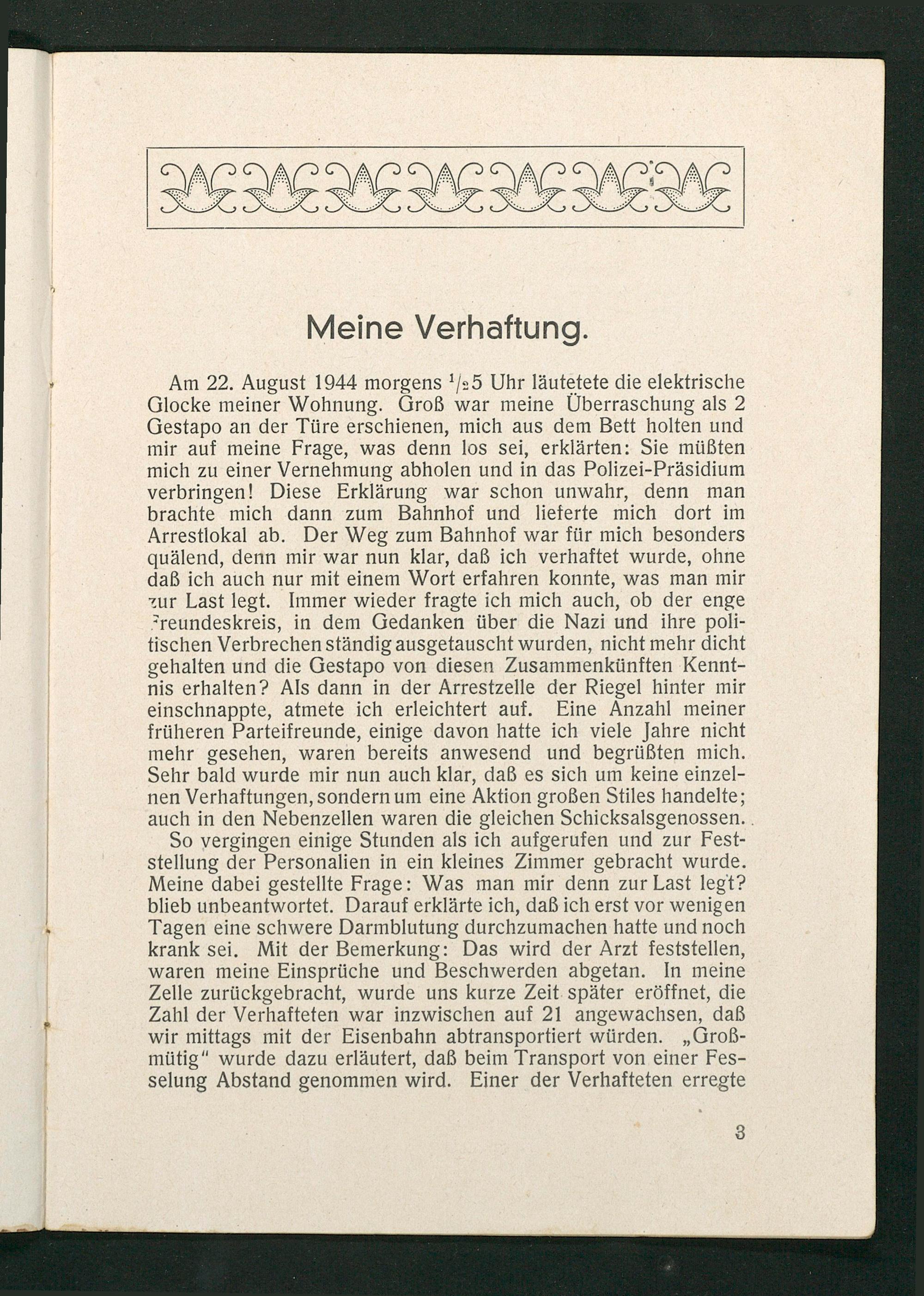 Am 22. August 1944 morgens 125 Uhr läutetete die elektrische Glocke meiner Wohnung. Groß war meine Überraschung als 2 Gestapo an der Türe erschienen, mich aus dem Bett holten und mir auf meine Frage, was denn los sei, erklärten: Sie müßten mich zu einer Vernehmung abholen und in das Polizei- Präsidium verbringen! Diese Erklärung war schon unwahr, denn man brachte mich dann zum Bahnhof und lieferte mich dort im Arrestlokal ab. Der Weg zum Bahnhof war für mich besonders quälend, denn mir war nun klar, daß ich verhaftet wurde, ohne daß ich auch nur mit einem Wort erfahren konnte, was man mir zur Last legt. Immer wieder fragte ich mich auch, ob der enge Freundeskreis, in dem Gedanken über die Nazi und ihre politischen Verbrechen ständig ausgetauscht wurden, nicht mehr dicht gehalten und die Gestapo von diesen Zusammenkünften Kenntnis erhalten? Als dann in der Arrestzelle der Riegel hinter mir einschnappte, atmete ich erleichtert auf. Eine Anzahl meiner früheren Parteifreunde, einige davon hatte ich viele Jahre nicht mehr gesehen, waren bereits anwesend und begrüßten mich. Sehr bald wurde mir nun auch klar, daß es sich um keine einzelnen Verhaftungen, sondern um eine Aktion großen Stiles handelte; auch in den Nebenzellen waren die gleichen Schicksalsgenossen..