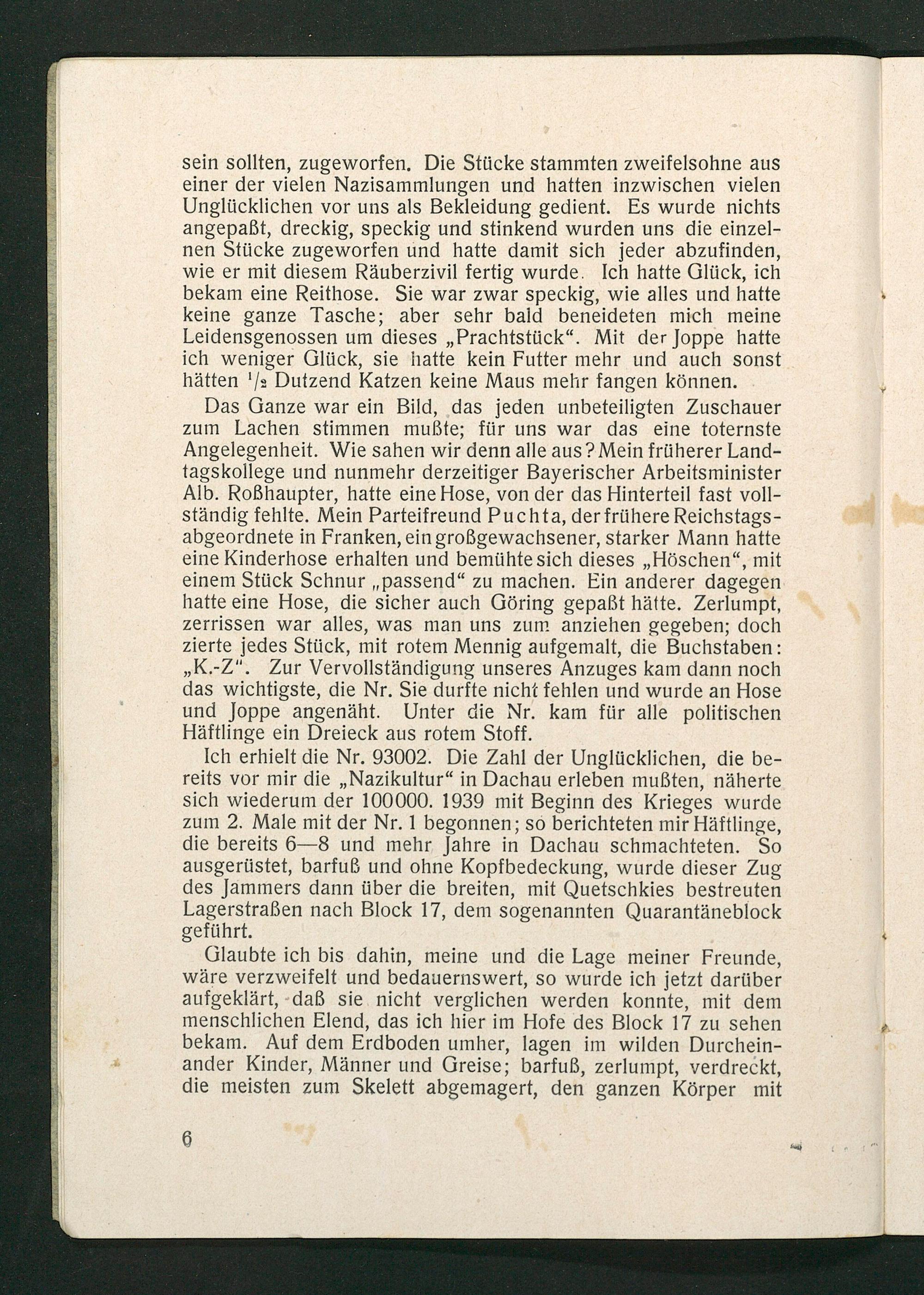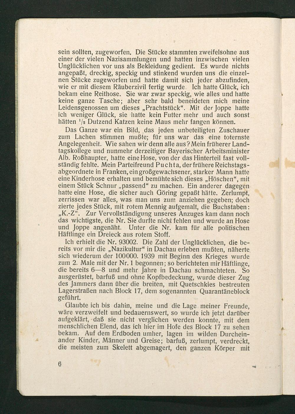 Ich erhielt die Nr. 93002. Die Zahl der Unglücklichen, die bereits vor mir die ,, Nazikultur" in Dachau erleben mußten, näherte sich wiederum der 100000. 1939 mit Beginn des Krieges wurde zum 2. Male mit der Nr. 1 begonnen; so berichteten mir Häftlinge, die bereits 6-8 und mehr Jahre in Dachau schmachteten. So ausgerüstet, barfuß und ohne Kopfbedeckung, wurde dieser Zug des Jammers dann über die breiten, mit Quetschkies bestreuten Lagerstraßen nach Block 17, dem sogenannten Quarantäneblock geführt.