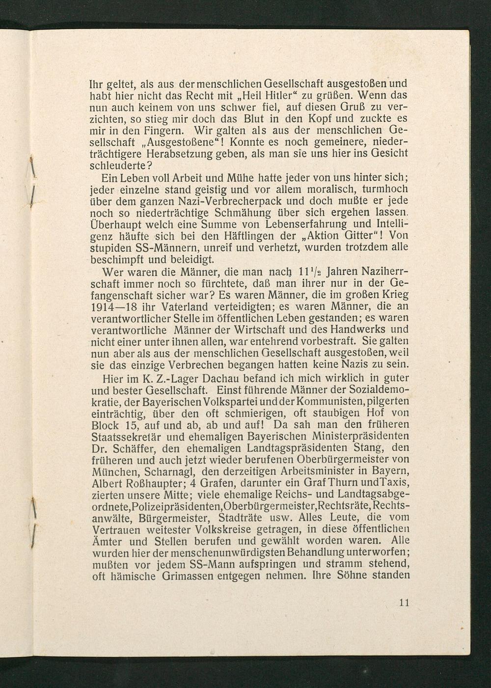 Hier im K. Z.- Lager Dachau befand ich mich wirklich in guter und bester Gesellschaft. Einst führende Männer der Sozialdemokratie, der Bayerischen Volkspartei und der Kommunisten, pilgerten einträchtig, über den oft schmierigen, oft staubigen Hof von Block 15, auf und ab, ab und auf! Da sah man den früheren Staatssekretär und ehemaligen Bayerischen Ministerpräsidenten Dr. Schäffer, den ehemaligen Landtagspräsidenten Stang, den früheren und auch jetzt wieder berufenen Oberbürgermeister von München, Scharnagl , den derzeitigen Arbeitsminister in Bayern , Albert Roßhaupter ; 4 Grafen, darunter ein Graf Thurn und Taxis, zierten unsere Mitte; viele ehemalige Reichs- und Landtagsabgeordnete, Polizeipräsidenten, Oberbürgermeister, Rechtsräte, Rechtsanwälte, Bürgermeister, Stadträte usw. Alles Leute, die vom Vertrauen weitester Volkskreise getragen, in diese öffentlichen Ämter und Stellen berufen und gewählt worden waren. Alle wurden hier der menschenunwürdigsten Behandlung unterworfen; mußten vor jedem SS- Mann aufspringen und stramm stehend, oft hämische Grimassen entgegen nehmen. Ihre Söhne standen