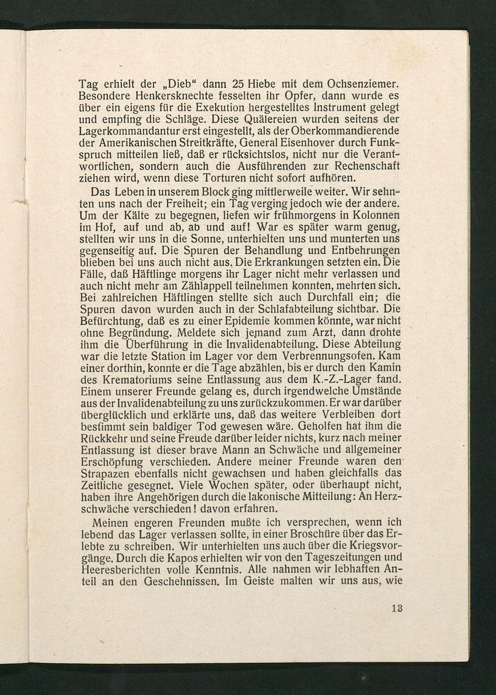 Tag erhielt der„ Dieb" dann 25 Hiebe mit dem Ochsenziemer. Besondere Henkersknechte fesselten ihr Opfer, dann wurde es über ein eigens für die Exekution hergestelltes Instrument gelegt und empfing die Schläge. Diese Quälereien wurden seitens der Lagerkommandantur erst eingestellt, als der Oberkommandierende der Amerikanischen Streitkräfte, General Eisenhover durch Funkspruch mitteilen ließ, daß er rücksichtslos, nicht nur die Verantwortlichen, sondern auch die Ausführenden zur Rechenschaft. ziehen wird, wenn diese Torturen nicht sofort aufhören.