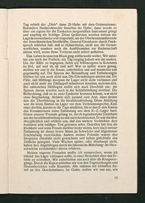 Meinen engeren Freunden mußte ich versprechen, wenn ich lebend das Lager verlassen sollte, in einer Broschüre über das Erlebte zu schreiben. Wir unterhielten uns auch über die Kriegsvorgänge. Durch die Kapos erhielten wir von den Tageszeitungen und Heeresberichten volle Kenntnis. Alle nahmen wir lebhaften Anteil an den Geschehnissen. Im Geiste malten wir uns aus, wie