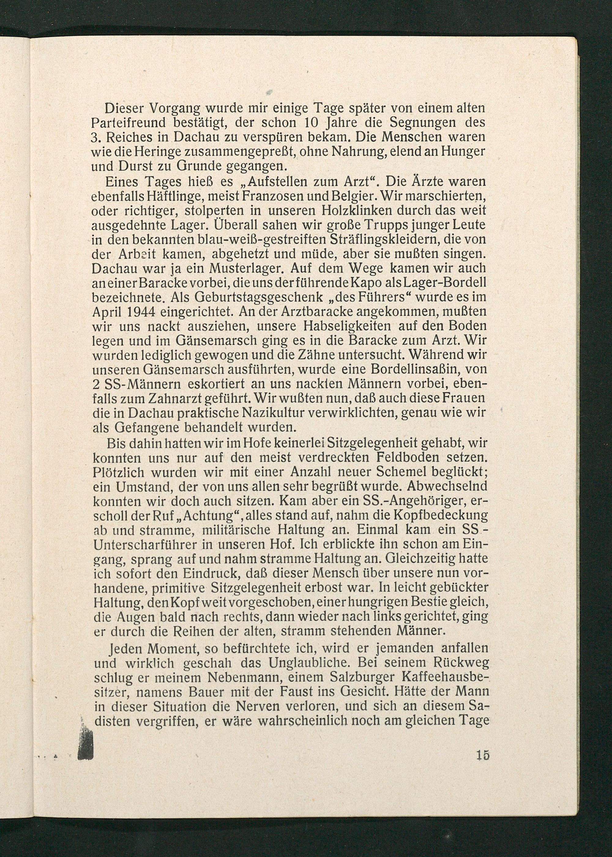 Dieser Vorgang wurde mir einige Tage später von einem alten Parteifreund bestätigt, der schon 10 Jahre die Segnungen des 3. Reiches in Dachau zu verspüren bekam. Die Menschen waren wie die Heringe zusammengepreßt, ohne Nahrung, elend an Hunger und Durst zu Grunde gegangen.