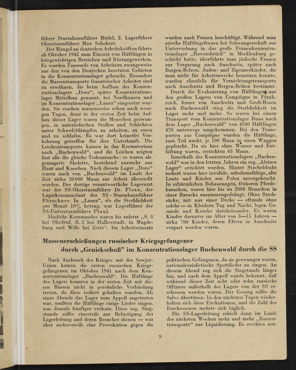 Der Mangel an deutschen Arbeitskräften führte ab Oktober 1942 zum Einsatz von Häftlingen in kriegswichtigen Betrieben und Rüstungswerken. Es wurden Tausende von Arbeitern zwangsweise aus den von den Deutschen besetzten Gebieten in die Konzentrationslager gebracht. Besonders die Massentransporte französischer Arbeiter sind zu erwähnen, die beim Aufbau des Konzentrationslagers ,, Dora", später Konzentrationslager Mittelbau genannt, bei Nordhausen und im Konzentrationslager ,, Laura" eingesetzt wurden. Sie starben massenweise schon nach wenigen Tagen, denn in der ersten Zeit beim Aufbau dieser Lager waren die Menschen gezwungen, in unterirdischen Stollen und Schächten unter Schwefeldämpfen zu arbeiten, zu essen und zu schlafen. Es war dort keinerlei Vorkehrung getroffen für ihre Unterkunft. Die Leichentransporte kamen in das Krematorium nach ,, Buchenwald ", und die Leichen zeigten fast alle die gleiche Todesursache: es waren abgemagerte Skelette, bestehend nurmehr aus Haut und Knochen. Nach diesem Lager ,, Dora" waren auch von ,, Buchenwald " im Laufe der Zeit zirka 30000 Mann zur Arbeit überstellt worden. Der dortige verantwortliche Lagerarzt war der SS- Obersturmführer Dr. Plaza, der Lagerkommandant der SS- Sturmbannführer Förschner. In ,, Laura", wo die Sterblichkeit pro Monat 10% betrug, war Lagerführer der SS- Untersturmführer Plaul.