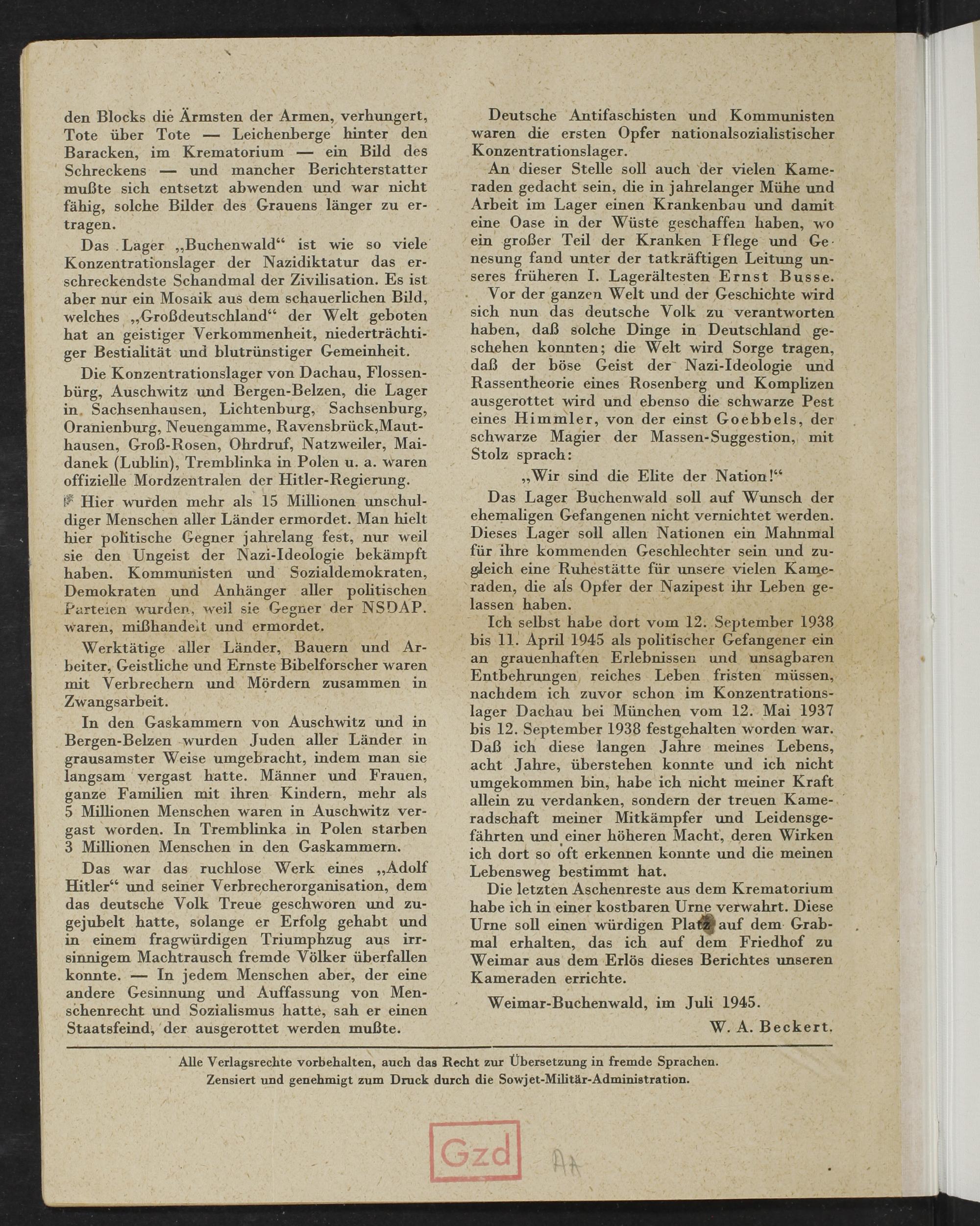 Alle Verlagsrechte vorbehalten, auch das Recht zur Übersetzung in fremde Sprachen. Zensiert und genehmigt zum Druck durch die Sowjet- Militär- Administration.