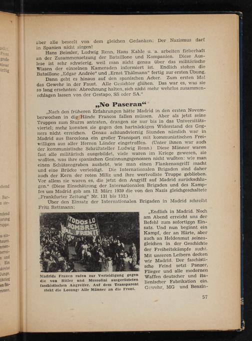 Dann geht es hinaus auf den spanischen Acker. Zum ersten Mal das Gewehr in der Faust. Alle Gesichter glühen. Das war es, was sie so lang ersehnten: Abrechnung halten, sich nicht mehr wehrlos zusammen- schlagen lassen von der Gestapo, SS oder SA,