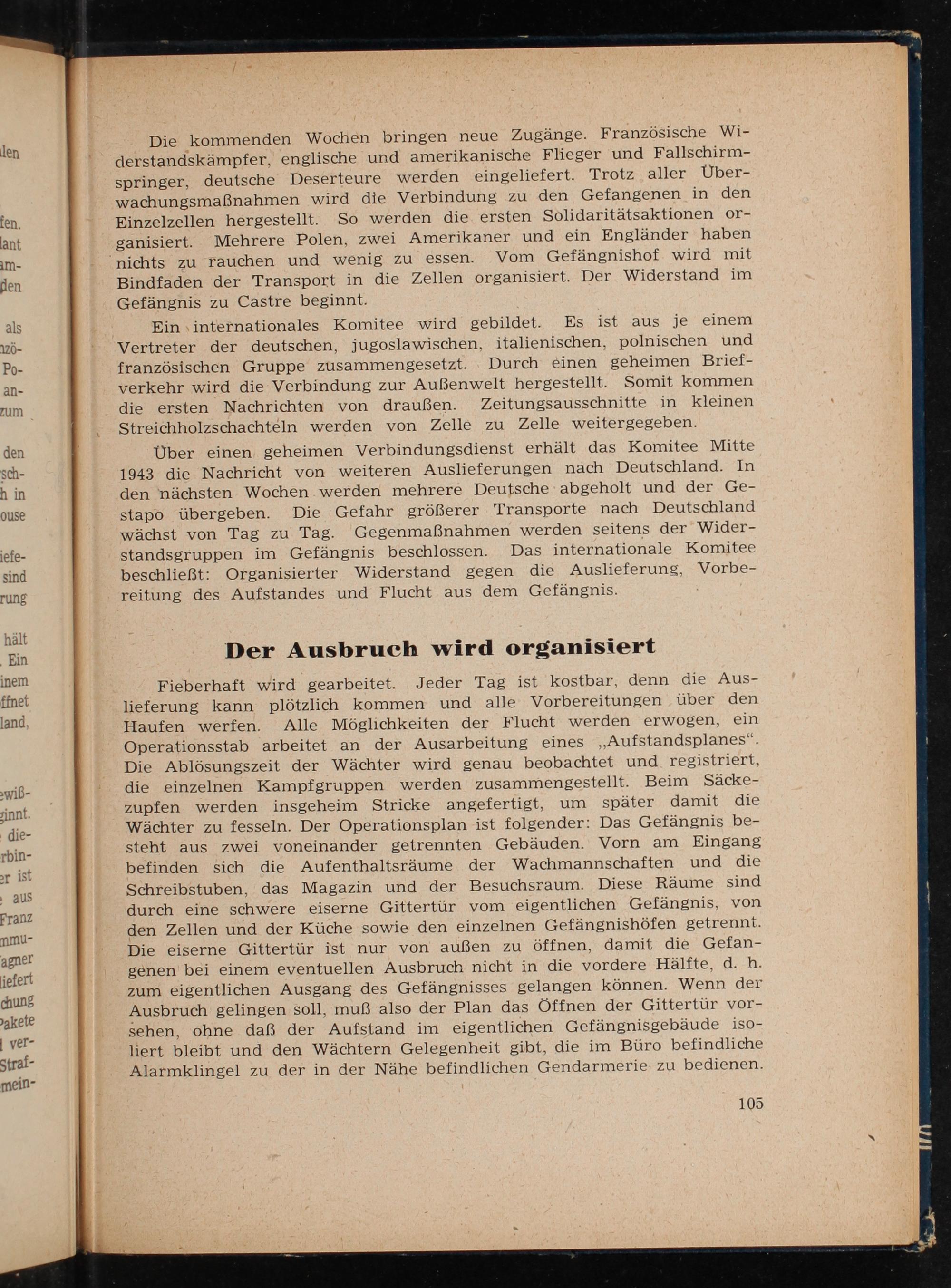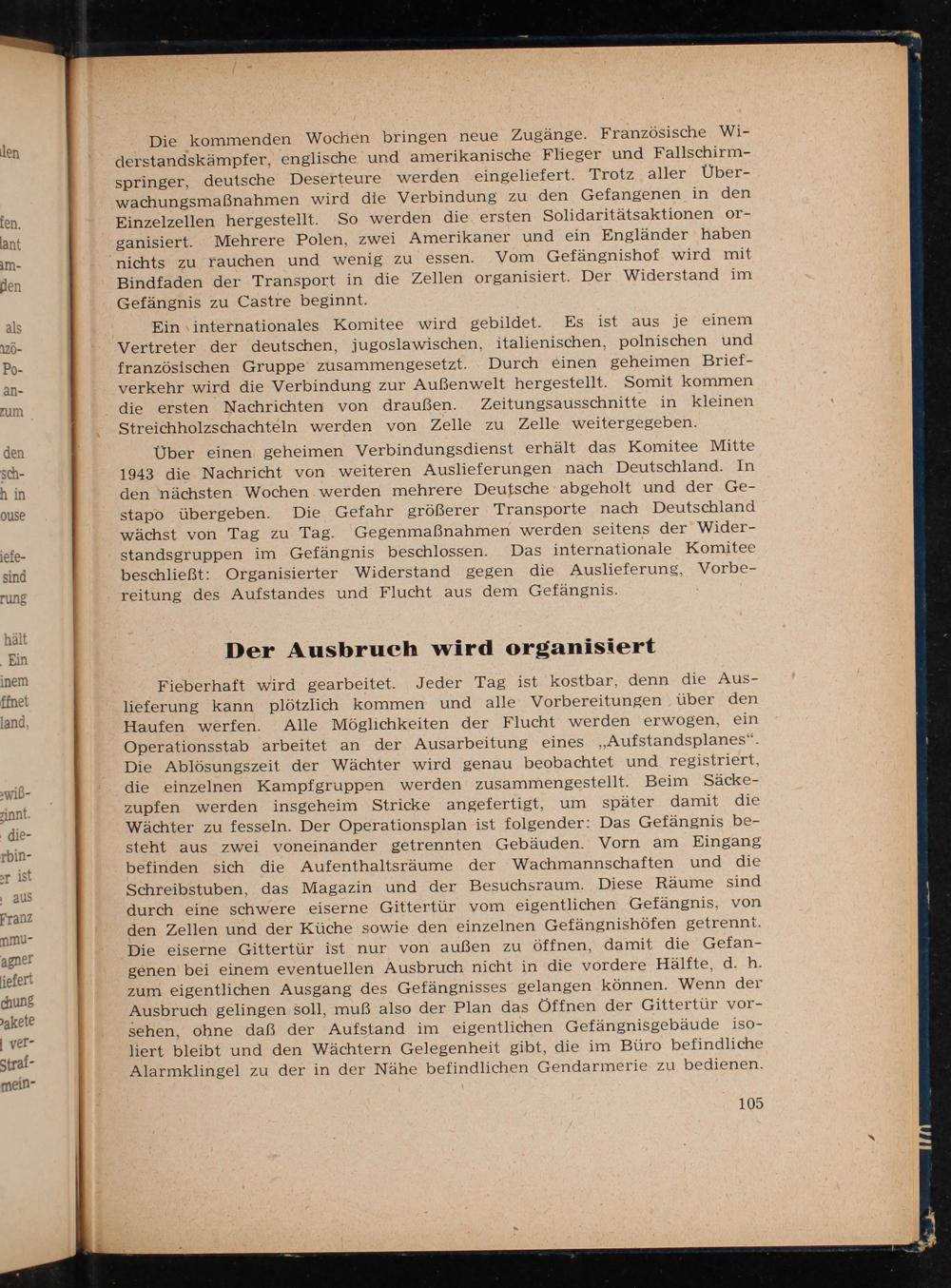 Über einen geheimen Verbindungsdienst erhält das Komitee Mitte 1943 die Nachricht von weiteren Auslieferungen nach Deutschland . In den nächsten Wochen werden mehrere Deutsche abgeholt und der Ge- stapo übergeben. Die Gefahr größerer Transporte nach Deutschland wächst von Tag zu Tag. Gegenmaßnahmen werden seitens der Wider- standsgruppen im Gefängnis beschlossen. Das internationale Komitee beschließt: Organisierter Widerstand gegen die Auslieferung, Vorbe- reitung des Aufstandes und Flucht aus dem Gefängnis.