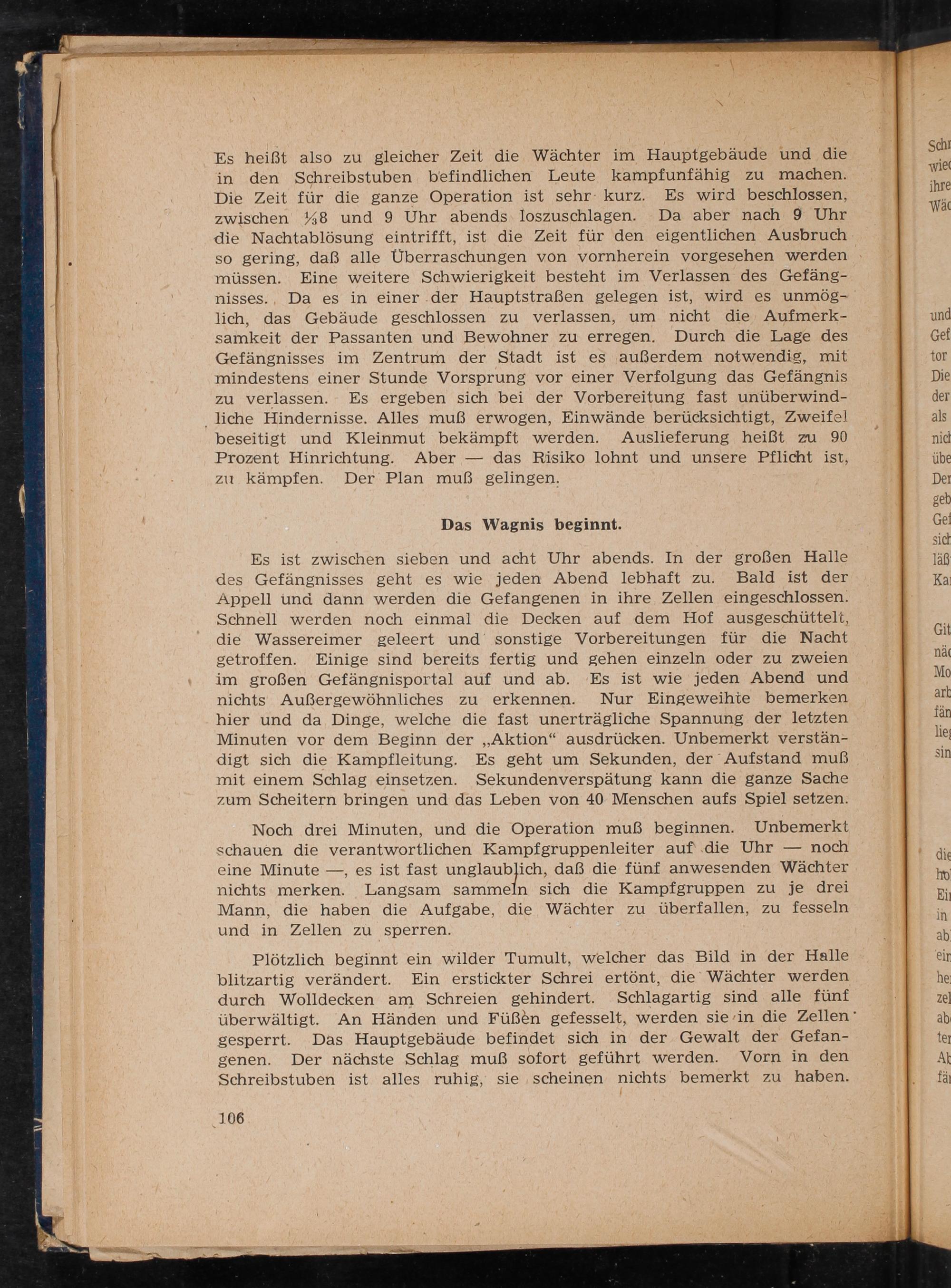 Es ist zwischen sieben und acht Uhr abends. In der großen Halle des Gefängnisses geht es wie jeden Abend lebhaft zu. Bald ist der Appell und dann werden die Gefangenen in ihre Zellen eingeschlossen. Schnell werden noch einmal die Decken auf dem Hof ausgeschüttelt, die Wassereimer geleert und sonstige Vorbereitungen für die Nacht getroffen. Einige sind bereits fertig und gehen einzeln oder zu zweien im großen Gefängnisportal auf und ab. Es ist wie jeden Abend und nichts Außergewöhnliches zu erkennen. Nur Eingeweihtie bemerken hier und da Dinge, welche die fast unerträgliche Spannung der letzten Minuten vor dem Beginn der„Aktion“ ausdrücken. Unbemerkt verstän- digt sich die Kampfleitung. Es geht um Sekunden, der Aufstand muß mit einem Schlag einsetzen. Sekundenverspätung kann die ganze Sache zum Scheitern bringen und das Leben von 40 Menschen aufs Spiel setzen.