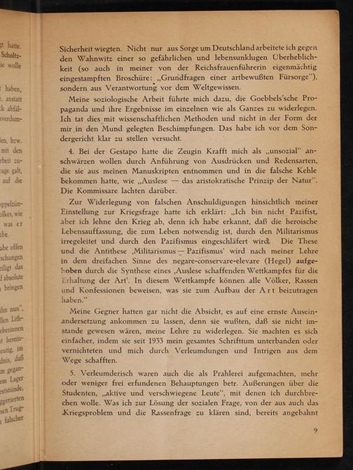 Meine soziologische Arbeit führte mich dazu, die Goebbels 'sche Propaganda und ihre Ergebnisse im einzelnen wie als Ganzes zu widerlegen. Ich tat dies mit wissenschaftlichen Methoden und nicht in der Form der mir in den Mund gelegten Beschimpfungen. Das habe ich vor dem Sondergericht klar zu stellen versucht.