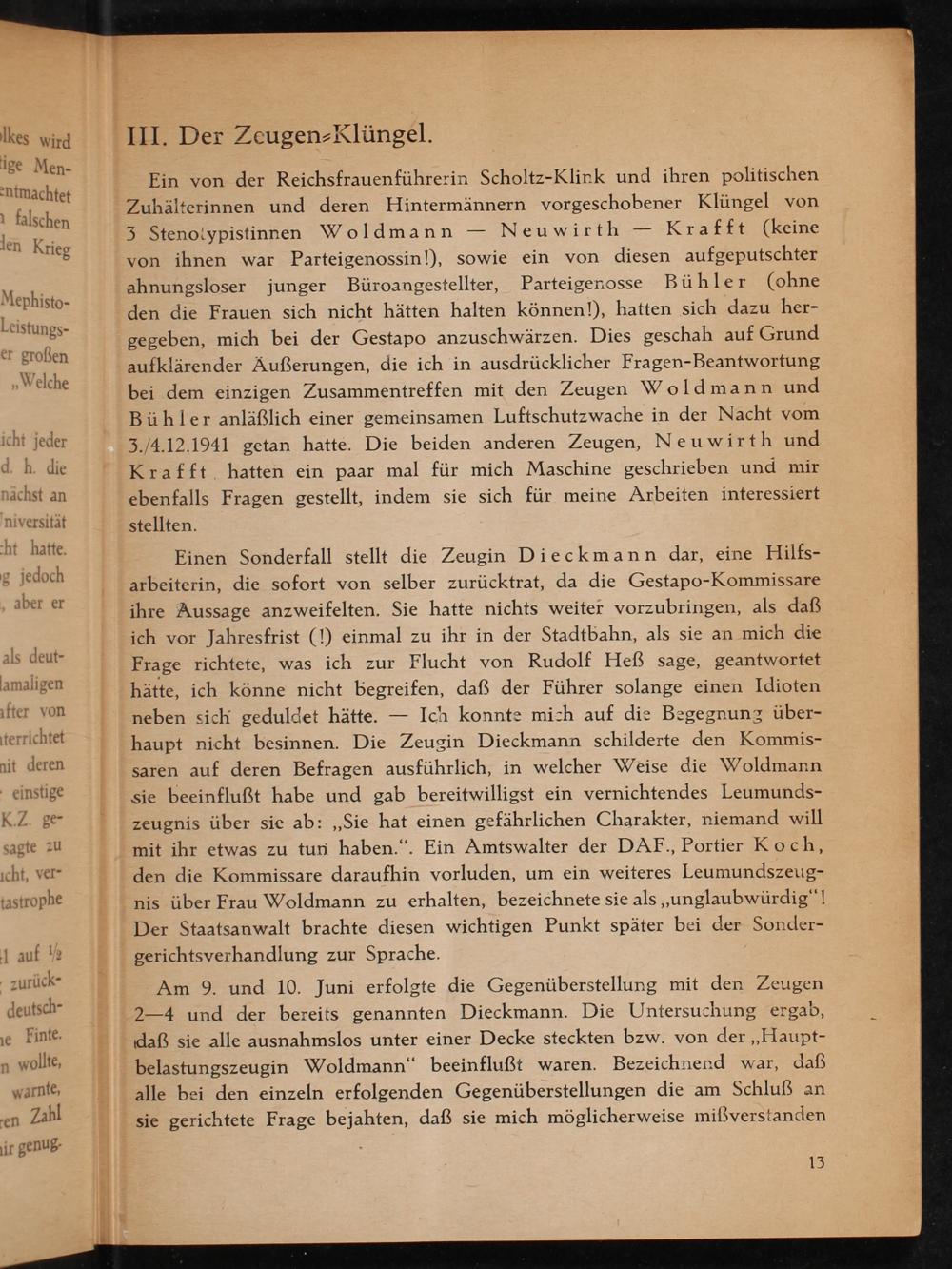 Einen Sonderfall stellt die Zeugin Dieckmann dar, eine Hilfsarbeiterin, die sofort von selber zurücktrat, da die Gestapo - Kommissare ihre Aussage anzweifelten. Sie hatte nichts weiter vorzubringen, als daß ich vor Jahresfrist(!) einmal zu ihr in der Stadtbahn, als sie an mich die Frage richtete, was ich zur Flucht von Rudolf Heẞ sage, geantwortet hätte, ich könne nicht begreifen, daß der Führer solange einen Idioten neben sich geduldet hätte. Ich konnte mich auf die Begegnung überhaupt nicht besinnen. Die Zeugin Dieckmann schilderte den Kommissaren auf deren Befragen ausführlich, in welcher Weise die Woldmann sie beeinflußt habe und gab bereitwilligst ein vernichtendes Leumundszeugnis über sie ab: ,, Sie hat einen gefährlichen Charakter, niemand will mit ihr etwas zu tun haben.". Ein Amtswalter der DAF., Portier Koch, den die Kommissare daraufhin vorluden, um ein weiteres Leumundszeugnis über Frau Woldmann zu erhalten, bezeichnete sie als ,, unglaubwürdig"! Der Staatsanwalt brachte diesen wichtigen Punkt später bei der Sondergerichtsverhandlung zur Sprache.