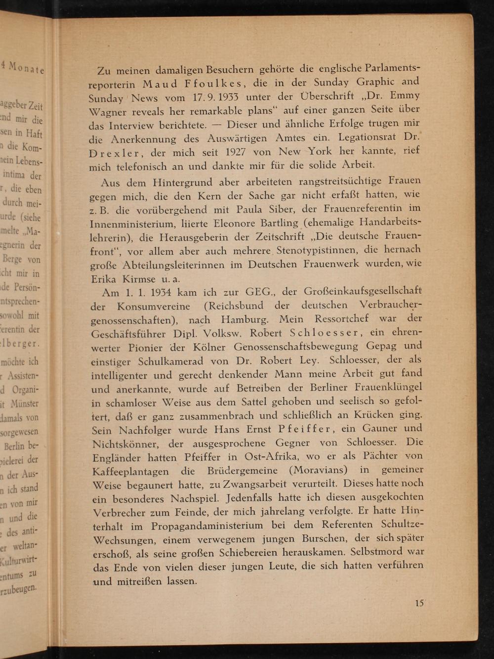 Am 1. 1. 1934 kam ich zur GEG., der Großeinkaufsgesellschaft der Konsumvereine( Reichsbund der deutschen Verbraucherder genossenschaften), nach Hamburg . Mein Ressortchef war Geschäftsführer Dipl. Volksw. Robert Schloesser, ein ehrenwerter Pionier der Kölner Genossenschaftsbewegung Gepag und einstiger Schulkamerad von Dr. Robert Ley. Schloesser, der als intelligenter und gerecht denkender Mann meine Arbeit gut fand und anerkannte, wurde auf Betreiben der Berliner Frauenklüngel in schamloser Weise aus dem Sattel gehoben und seelisch so gefoltert, daß er ganz zusammenbrach und schließlich an Krücken ging. Sein Nachfolger wurde Hans Ernst Pfeiffer, ein Gauner und Nichtskönner, der ausgesprochene Gegner von Schloesser. Die Engländer hatten Pfeiffer in Ost- Afrika, wo er als Pächter von Kaffeeplantagen die Brüdergemeine( Moravians) in gemeiner Weise begaunert hatte, zu Zwangsarbeit verurteilt. Dieses hatte noch ein besonderes Nachspiel. Jedenfalls hatte ich diesen ausgekochten Verbrecher zum Feinde, der mich jahrelang verfolgte. Er hatte Hinterhalt im Propagandaministerium bei dem Referenten SchultzeWechsungen, einem verwegenem jungen Burschen, der sich später erschoß, als seine großen Schiebereien herauskamen. Selbstmord war das Ende von vielen dieser jungen Leute, die sich hatten verführen und mitreißen lassen.