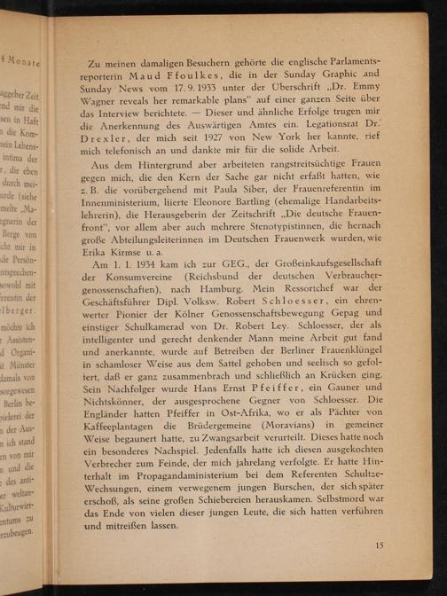 Zu meinen damaligen Besuchern gehörte die englische Parlamentsreporterin Maud Ffoulkes, die in der Sunday Graphic and Sunday News vom 17.9.1933 unter der Überschrift ,, Dr. Emmy Wagner reveals her remarkable plans" auf einer ganzen Seite über das Interview berichtete. Dieser und ähnliche Erfolge trugen mir die Anerkennung des Auswärtigen Amtes ein. Legationsrat Dr. Drexler, der mich seit 1927 von New York her kannte, rief mich telefonisch an und dankte mir für die solide Arbeit.