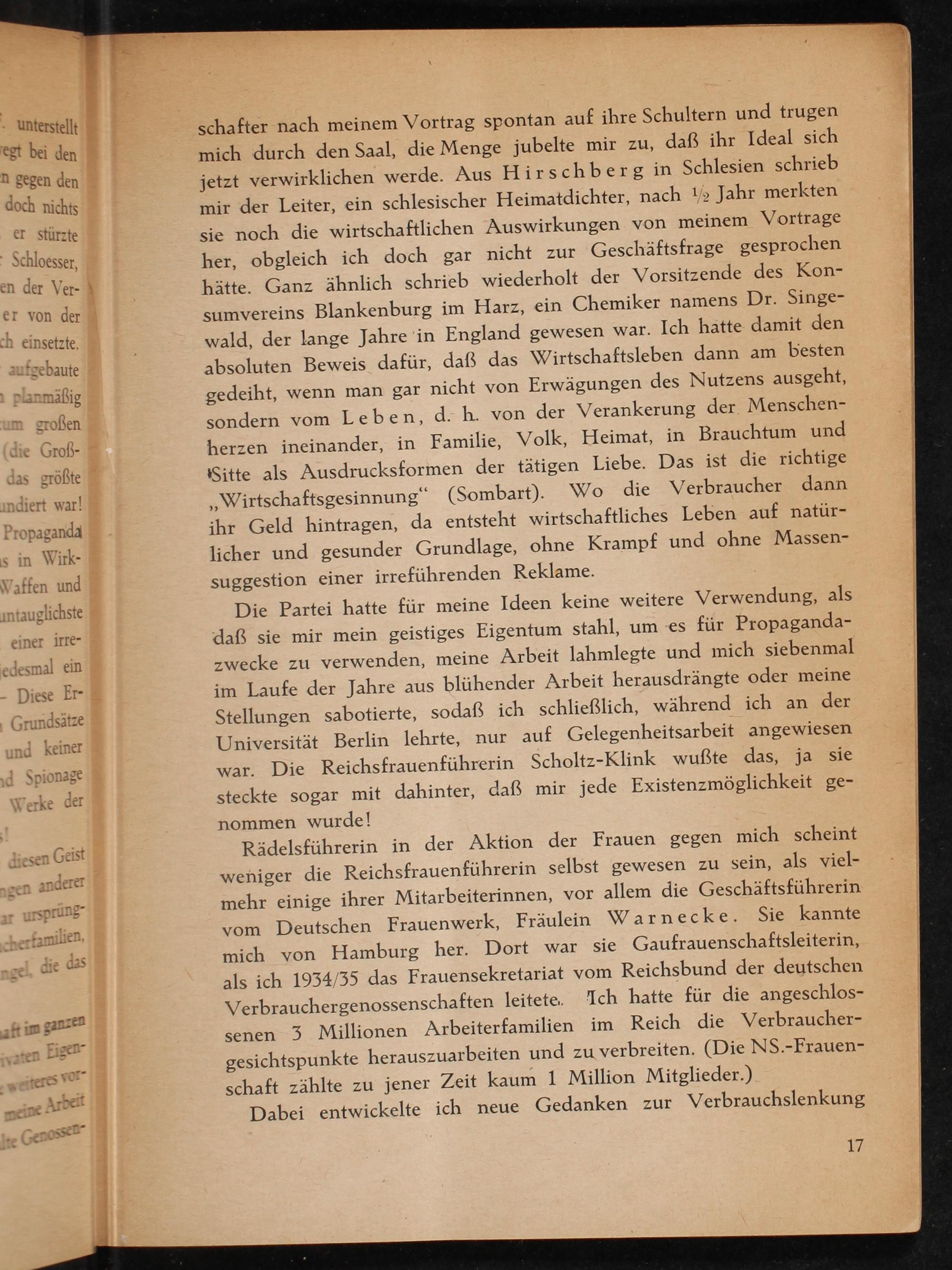 Rädelsführerin in der Aktion der Frauen gegen mich scheint weniger die Reichsfrauenführerin selbst gewesen zu sein, als vielmehr einige ihrer Mitarbeiterinnen, vor allem die Geschäftsführerin vom Deutschen Frauenwerk, Fräulein Warnecke. Sie kannte mich von Hamburg her. Dort war sie Gaufrauenschaftsleiterin, als ich 1934/35 das Frauensekretariat vom Reichsbund der deutschen Verbrauchergenossenschaften leitete. Ich hatte für die angeschlossenen 3 Millionen Arbeiterfamilien im Reich die Verbrauchergesichtspunkte herauszuarbeiten und zu verbreiten.( Die NS. - Frauenschaft zählte zu jener Zeit kaum 1 Million Mitglieder.).