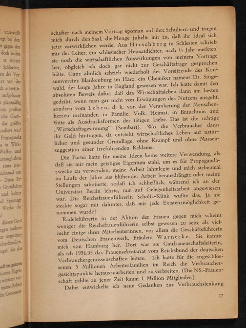 Die Partei hatte für meine Ideen keine weitere Verwendung, als daß sie mir mein geistiges Eigentum stahl, um es für Propagandazwecke zu verwenden, meine Arbeit lahmlegte und mich siebenmal im Laufe der Jahre aus blühender Arbeit herausdrängte oder meine Stellungen sabotierte, sodaß ich schließlich, während ich an der Universität Berlin lehrte, nur auf Gelegenheitsarbeit angewiesen war. Die Reichsfrauenführerin Scholtz- Klink wußte das, ja sie steckte sogar mit dahinter, daß mir jede Existenzmöglichkeit genommen wurde!