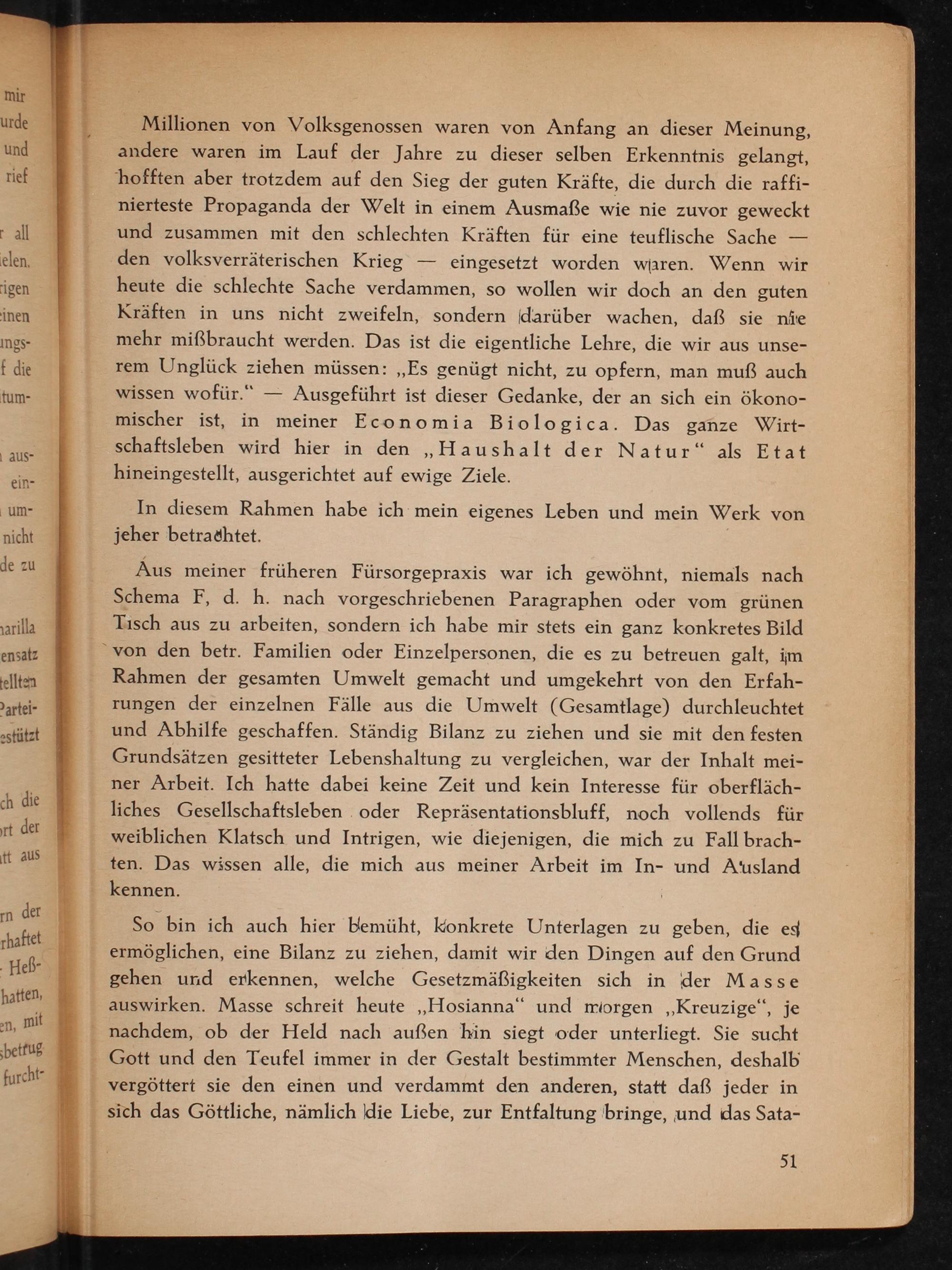 Aus meiner früheren Fürsorgepraxis war ich gewöhnt, niemals nach Schema F, d. h. nach vorgeschriebenen Paragraphen oder vom grünen Tisch aus zu arbeiten, sondern ich habe mir stets ein ganz konkretes Bild von den betr. Familien oder Einzelpersonen, die es zu betreuen galt, im Rahmen der gesamten Umwelt gemacht und umgekehrt von den Erfahrungen der einzelnen Fälle aus die Umwelt( Gesamtlage) durchleuchtet und Abhilfe geschaffen. Ständig Bilanz zu ziehen und sie mit den festen Grundsätzen gesitteter Lebenshaltung zu vergleichen, war der Inhalt meiner Arbeit. Ich hatte dabei keine Zeit und kein Interesse für oberflächliches Gesellschaftsleben oder Repräsentationsbluff, noch vollends für weiblichen Klatsch und Intrigen, wie diejenigen, die mich zu Fall brachten. Das wissen alle, die mich aus meiner Arbeit im In- und Ausland kennen.