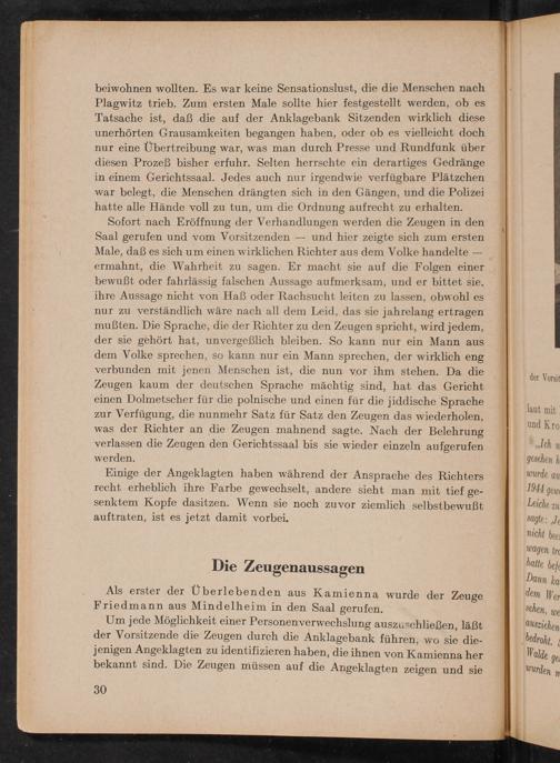 beiwohnen wollten. Es war keine Sensationslust, die die Menschen nach Plagwitz trieb. Zum ersten Male sollte hier festgestellt werden, ob es Tatsache ist, daß die auf der Anklagebank Sitzenden wirklich diese unerhörten Grausamkeiten begangen haben, oder ob es vielleicht doch nur eine Übertreibung war, was man durch Presse und Rundfunk über diesen Prozeß bisher erfuhr. Selten herrschte ein derartiges Gedränge in einem Gerichtssaal. Jedes auch nur irgendwie verfügbare Plätzchen war belegt, die Menschen drängten sich in den Gängen, und die Polizei hatte alle Hände voll zu tun, um die Ordnung aufrecht zu erhalten. Sofort nach Eröffnung der Verhandlungen werden die Zeugen in den Saal gerufen und vom Vorsitzenden und hier zeigte sich zum ersten Male, daß es sich um einen wirklichen Richter aus dem Volke handelte- ermahnt, die Wahrheit zu sagen. Er macht sie auf die Folgen einer bewußt oder fahrlässig falschen Aussage aufmerksam, und er bittet sie, ihre Aussage nicht von Haß oder Rachsucht leiten zu lassen, obwohl es nur zu verständlich wäre nach all dem Leid, das sie jahrelang ertragen mußten. Die Sprache, die der Richter zu den Zeugen spricht, wird jedem, der sie gehört hat, unvergeßlich bleiben. So kann nur ein Mann aus dem Volke sprechen, so kann nur ein Mann sprechen, der wirklich eng verbunden mit jenen Menschen ist, die nun vor ihm stehen. Da die Zeugen kaum der deutschen Sprache mächtig sind, hat das Gericht einen Dolmetscher für die polnische und einen für die jiddische Sprache zur Verfügung, die nunmehr Satz für Satz den Zeugen das wiederholen, was der Richter an die Zeugen mahnend sagte. Nach der Belehrung verlassen die Zeugen den Gerichtssaal bis sie wieder einzeln aufgerufen werden.