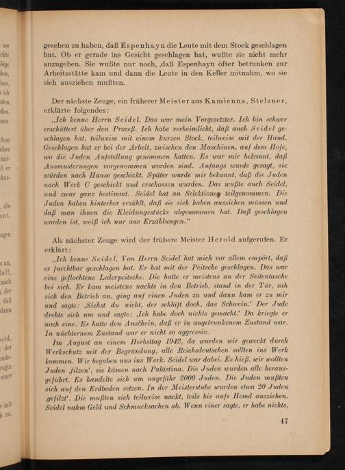 ,, Ich kenne Herrn Seidel. Das war mein Vorgesetzter. Ich bin schwer erschüttert über den Prozeß. Ich habe verheimlicht, daß auch Seidel geschlagen hat, teilweise mit einem kurzen Stock, teilweise mit der Hand. Geschlagen hat er bei der Arbeit, zwischen den Maschinen, auf dem Hofe, wo die Juden Aufstellung genommen hatten. Es war mir bekannt, daß Ausmusterungen vorgenommen worden sind. Anfangs wurde gesagt, sie würden nach Hause geschickt. Später wurde mir bekannt, daß die Juden nach Werk C geschickt und erschossen wurden. Das wußte auch Seidel, und zwar ganz bestimmt. Seidel hat an Selektionen teilgenommen. Die Juden haben hinterher erzählt, daß sie sich haben ausziehen müssen und daß man ihnen die Kleidungsstücke abgenommen hat. Daß geschlagen worden ist, weiß ich nur aus Erzählungen."