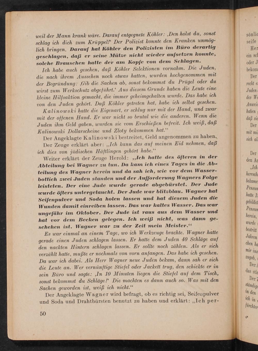 Weiter erklärt der Zeuge Herold: ,, Ich hatte des öfteren in der Abteilung bei Wagner zu tun. Da kam ich eines Tages in die Abteilung des Wagner herein und da sah ich, wie vor dem Wasserbottich zwei Juden standen und der Aufforderung Wagners Folge leisteten. Der eine Jude wurde gerade abgebürstet. Der Jude wurde öfters untergetaucht. Der Jude war blitzblau. Wagner hat Seifenpulver und Soda holen lassen und hat diesem Juden die Wunden damit einreiben lassen. Das war kaltes Wasser. Das war ungefähr im Oktober. Der Jude ist raus aus dem Wasser und hat vor dem Becken gelegen. Ich weiß nicht, was dann geschehen ist. Wagner war zu der Zeit mein Meister."