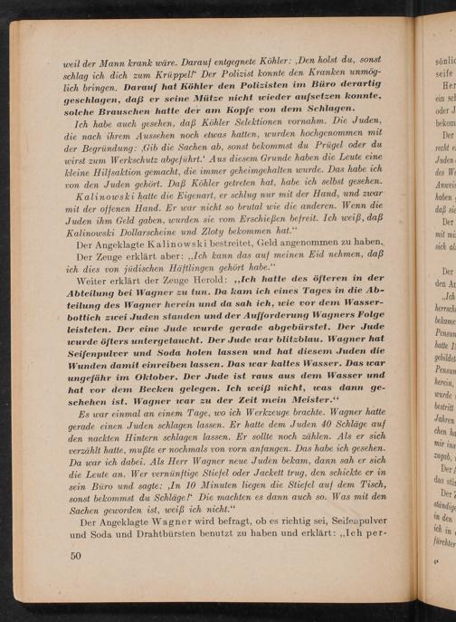 Der Angeklagte Kalinowski bestreitet, Geld angenommen zu haben. Der Zeuge erklärt aber: ,, Ich kann das auf meinen Eid nehmen, daß ich dies von jüdischen Häftlingen gehört habe."