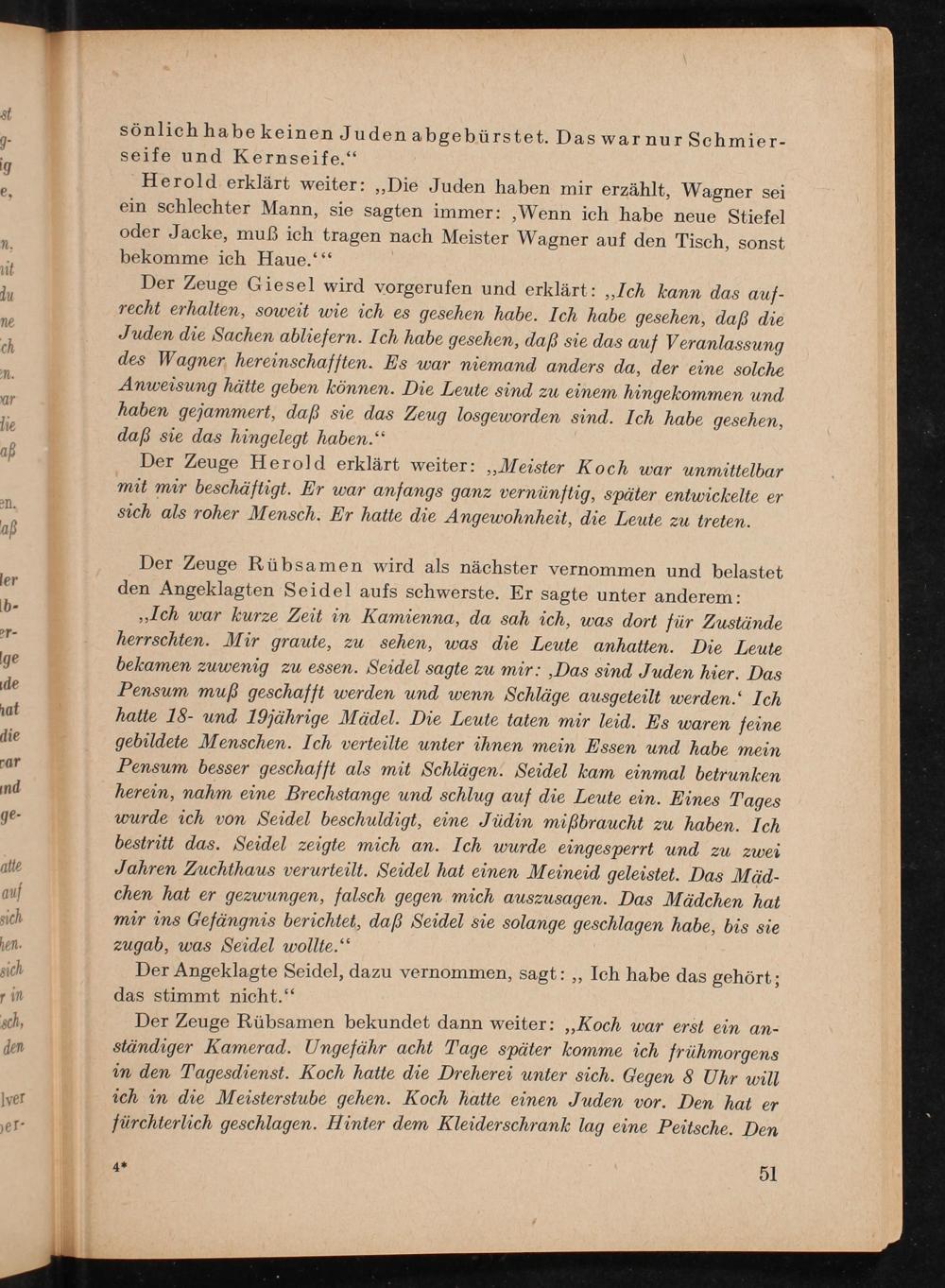 „Ich war kurze Zeit in Kamienna, da sah ich, was dort für Zustände herrschten. Mir graute, zu sehen, was die Leute anhatten. Die Leute bekamen zuwenig zu essen. Seidel sagte zu mir: ‚Das sind Juden hier. Das Pensum muß geschafft werden und wenn Schläge ausgeteilt werden.‘ Ich hatte 18- und 19jährige Mädel. Die Leute taten mir leid. Es waren feine gebildete Menschen. Ich verteilte unter ihnen mein Essen und habe mein Pensum besser geschafft als mit Schlägen. Seidel kam einmal betrunken herein, nahm eine Brechstange und schlug auf die Leute ein. Eines Tages wurde ich von Seidel beschuldigt, eine Jüdin mißbraucht zu haben. Ich bestritt das. Seidel zeigte mich an. Ich wurde eingesperrt und zu zwei Jahren Zuchthaus verurteilt. Seidel hat einen Meineid geleistet. Das Mäd- chen hat er gezwungen, falsch gegen mich auszusagen. Das Mädchen hat mir ins Gefängnis berichtet, daß Seidel sie solange geschlagen habe, bis sie zugab, was Seidel wollte.“