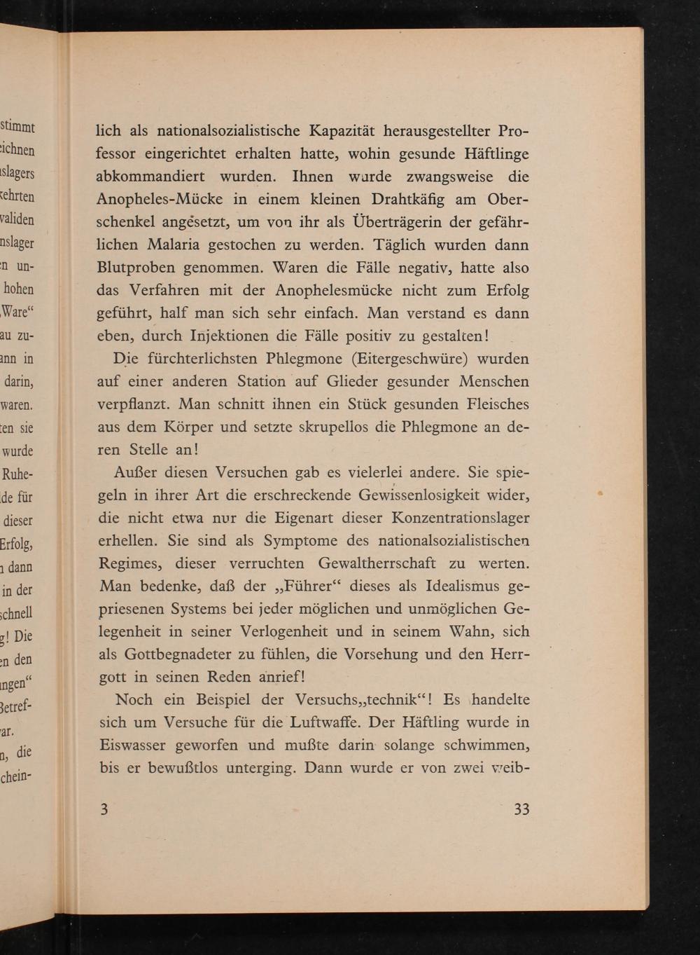 Außer diesen Versuchen gab es vielerlei andere. Sie spie- geln in ihrer Art die erschreckende Gewissenlosigkeit wider, die nicht etwa nur die Eigenart dieser Konzentrationslager erhellen. Sie sind als Symptome des nationalsozialistischen Regimes, dieser verruchten Gewaltherrschaft zu werten. Man bedenke, daß der ‚Führer‘ dieses als Idealismus ge- priesenen Systems bei jeder möglichen und unmöglichen Ge- legenheit in seiner Verlogenheit und in seinem Wahn, sich als Gottbegnadeter zu fühlen, die Vorsehung und den Herr- gott in seinen Reden anrief!