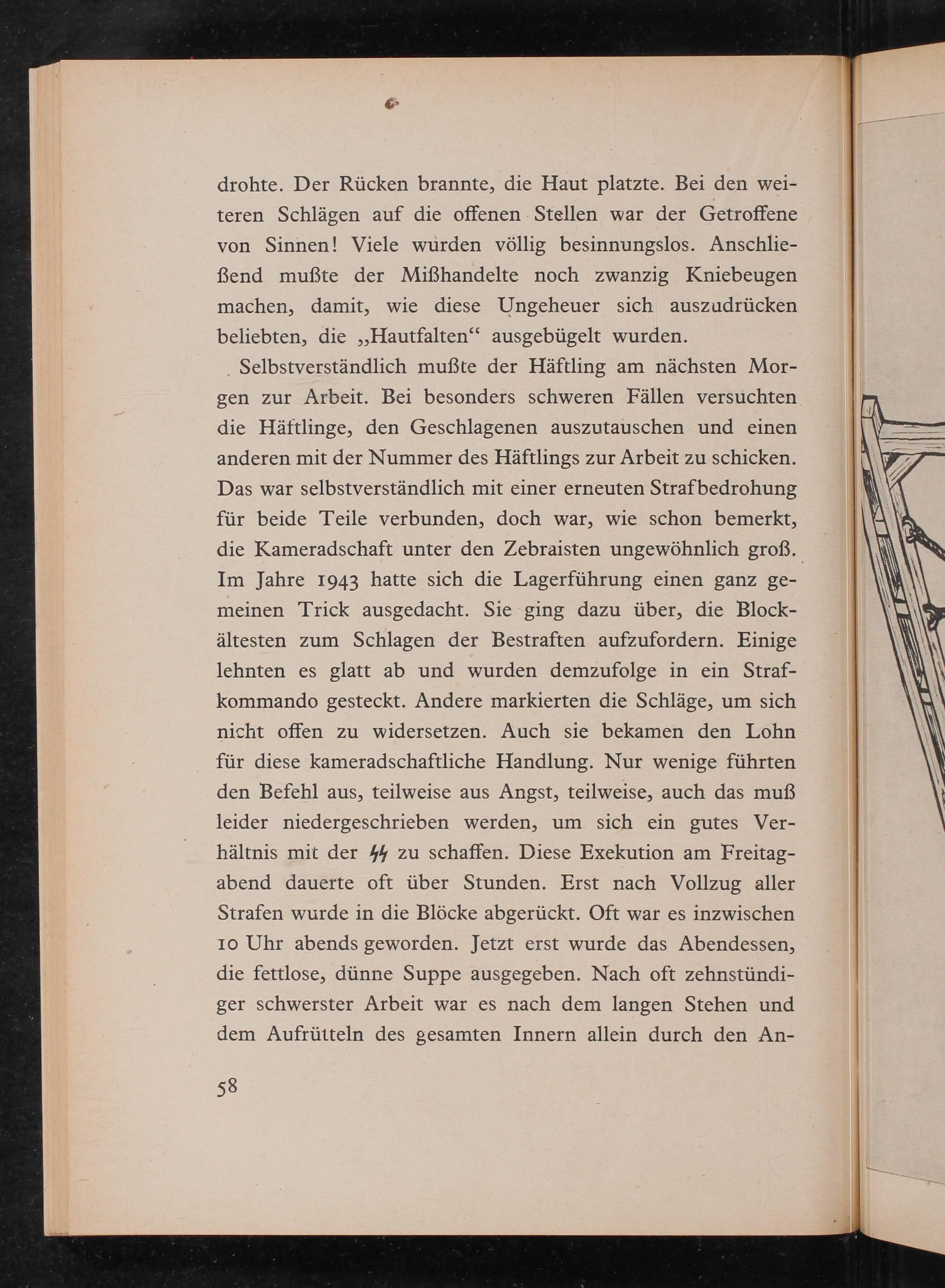 Selbstverständlich mußte der Häftling am nächsten Morgen zur Arbeit. Bei besonders schweren Fällen versuchten die Häftlinge, den Geschlagenen auszutauschen und einen anderen mit der Nummer des Häftlings zur Arbeit zu schicken. Das war selbstverständlich mit einer erneuten Strafbedrohung für beide Teile verbunden, doch war, wie schon bemerkt, die Kameradschaft unter den Zebraisten ungewöhnlich groß. Im Jahre 1943 hatte sich die Lagerführung einen ganz gemeinen Trick ausgedacht. Sie ging dazu über, die Blockältesten zum Schlagen der Bestraften aufzufordern. Einige lehnten es glatt ab und wurden demzufolge in ein Strafkommando gesteckt. Andere markierten die Schläge, um sich nicht offen zu widersetzen. Auch sie bekamen den Lohn für diese kameradschaftliche Handlung. Nur wenige führten den Befehl aus, teilweise aus Angst, teilweise, auch das muß leider niedergeschrieben werden, um sich ein gutes Verhältnis mit der 44 zu schaffen. Diese Exekution am Freitagabend dauerte oft über Stunden. Erst nach Vollzug aller Strafen wurde in die Blöcke abgerückt. Oft war es inzwischen 10 Uhr abends geworden. Jetzt erst wurde das Abendessen, die fettlose, dünne Suppe ausgegeben. Nach oft zehnstündiger schwerster Arbeit war es nach dem langen Stehen und dem Aufrütteln des gesamten Innern allein durch den An