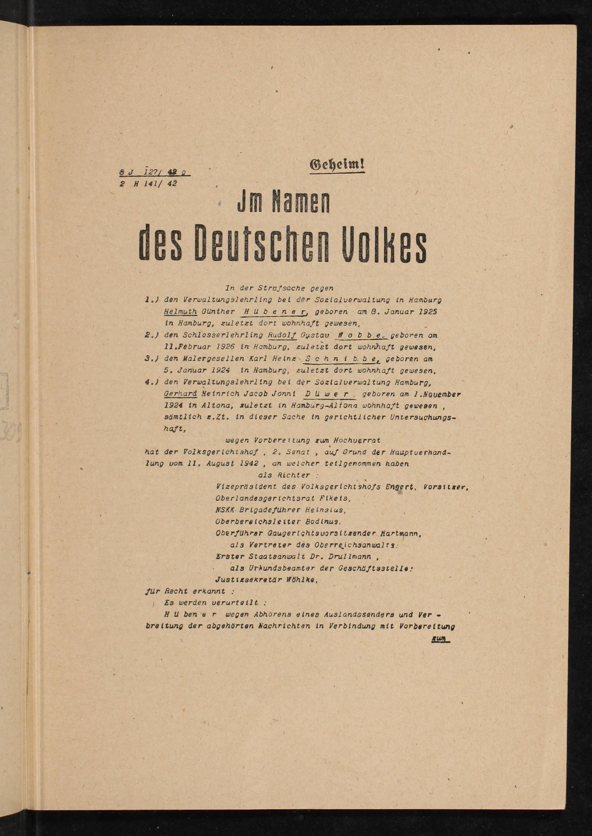 1.) den Verwaltungslehrling bel der Sozialverwaltung in Hamburg Helmuth Gunther Hubener , geboren am 8. Januar 1925 in Hamburg , zuletzt dort wohnhaft gewesen,