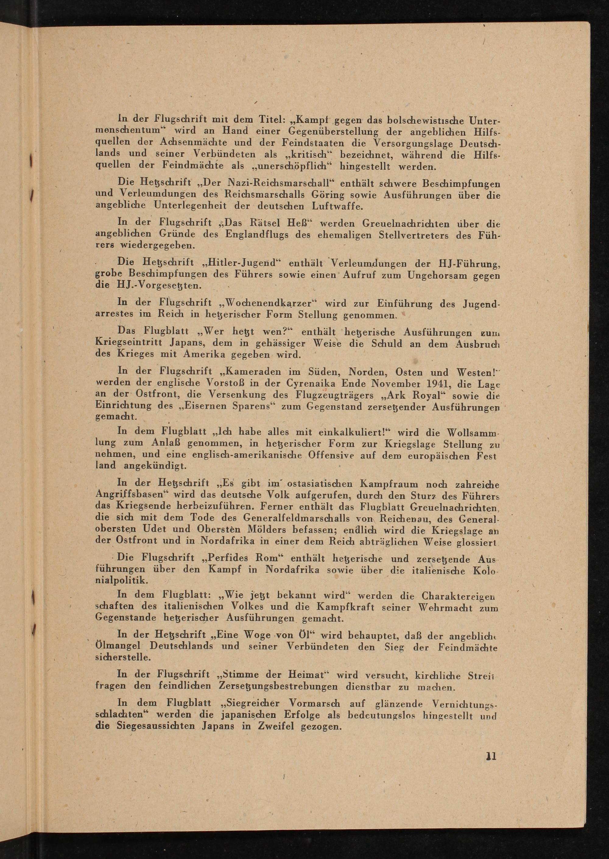 In der Flugschrift ,, Kameraden im Süden, Norden, Osten und Westen!" werden der englische Vorstoß in der Cyrenaika Ende November 1941, die Lage an der Ostfront, die Versenkung des Flugzeugträgers Ark Royal" sowie die Einrichtung des ,, Eisernen Sparens" zum Gegenstand zersetzender Ausführungen gemacht.