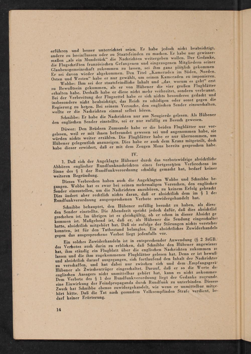 Wohbe: Ihm sei der staatsfeindliche Inhalt und„das, worum es geht“ erst zu Bewußtsein gekommen, als er von Hübener die vier großen Flugblätter erhalten habe. Deshalb habe er diese nicht mehr verbreitet, sondern verbrannt. Bei der Verbreitung der Flugzettel habe er sich nichts besonderes gedacht und insbesondere nicht beabsichtigt, das Reich zu schädigen oder sonst gegen die Regierurg zu heten. Bei seinem Versuche, den englischen Sender einzuschalten, wollte er die Nachrichten einmal selbst hören.