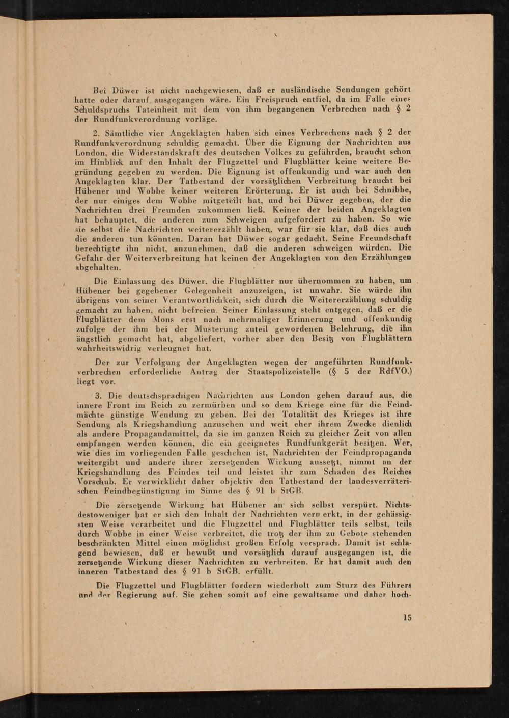 Die zersegende Wirkung hat Hübener an sich selbst verspürt. Nichts- destoweniger bat er sich den Inhalt der Nachrichten vern erkt, in der gehässig- sten Weise verarbeitet und die Flugzettel und Flugblätter teils selbst, teils durch Wobbe in einer Weise verbreitet, die trog der ihm zu Gebote stehenden beschränkten Mittel einen möglichst großen Erfolg versprach. Damit ist schla- gend bewiesen, daß er bewußt und vorsäglich darauf ausgegangen ist, die zersegende Wirkung dieser Nachrichten zu verbreiten. Er hat damit auch den inneren Tatbestand des$ 91 b StGB. erfüllt.