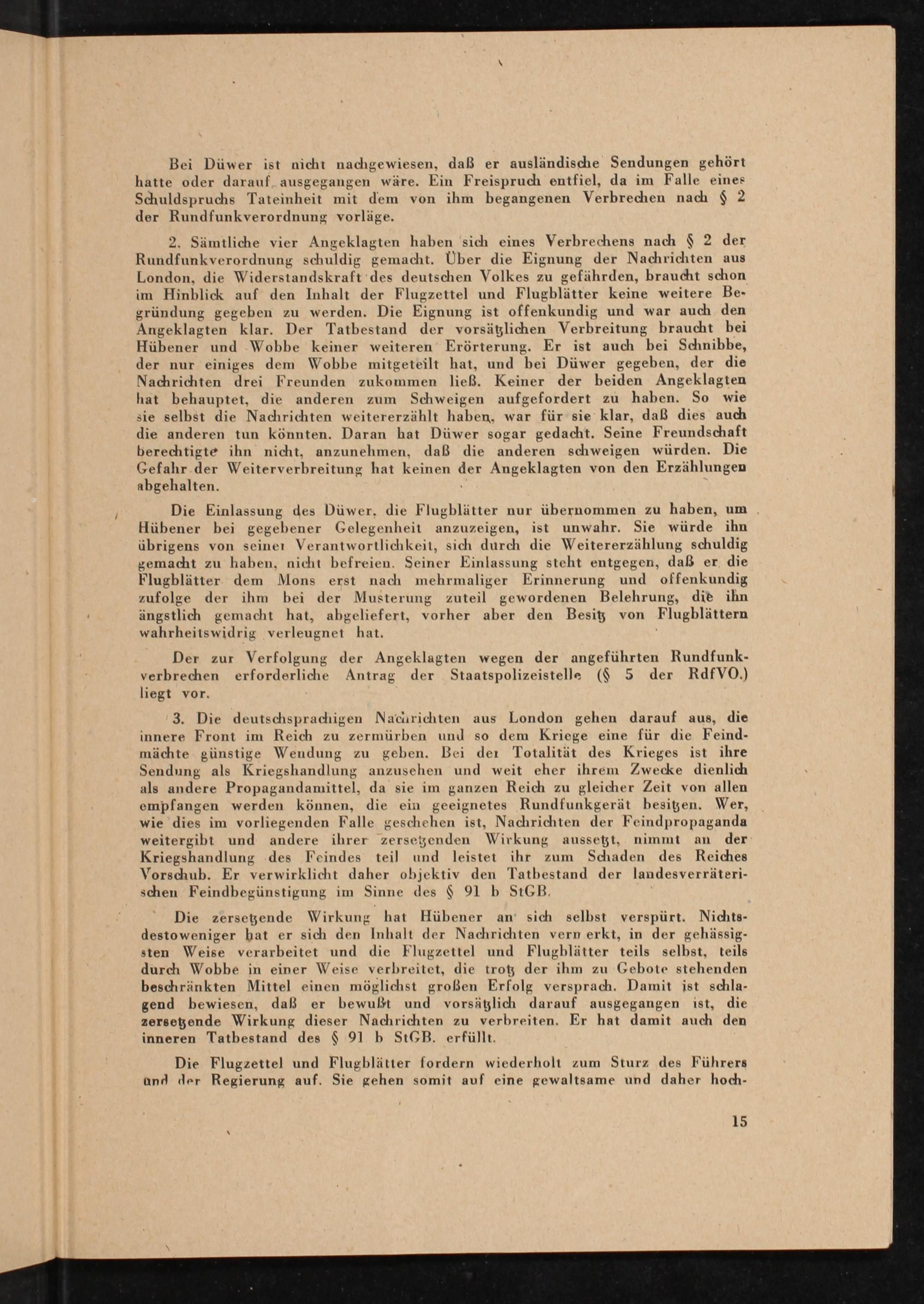 Die zersegende Wirkung hat Hübener an’ sich selbst verspürt. Nichts- destoweniger bat er sich den Inhalt der Nachrichten vern erkt, in der gehässig- sten Weise verarbeitet und die Flugzettel und Flugblätter teils selbst, teils durch Wobbe in einer Weise verbreitet, die trog der ihm zu Gebote stehenden beschränkten Mittel einen möglichst großen Erfolg versprach. Damit ist schla- gend bewiesen, daß er bewußt und vorsäglich darauf ausgegangen ist, die zersegende Wirkung dieser Nachrichten zu verbreiten. Er hat damit auch den inneren Tatbestand des$ 91 b StGB. erfüllt.