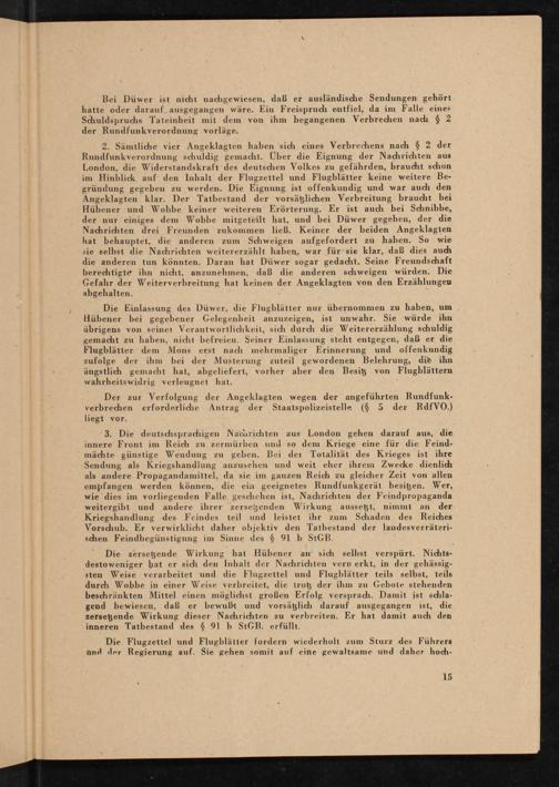 Bei Düwer ist nicht nachgewiesen, daß er ausländische Sendungen gehört hatte oder darauf ausgegangen wäre. Ein Freispruch entfiel, da im Falle eines Schuldspruchs Tateinheit mit dem von ihm begangenen Verbrechen nach$ 2 der Rundfunkverordnung vorläge.