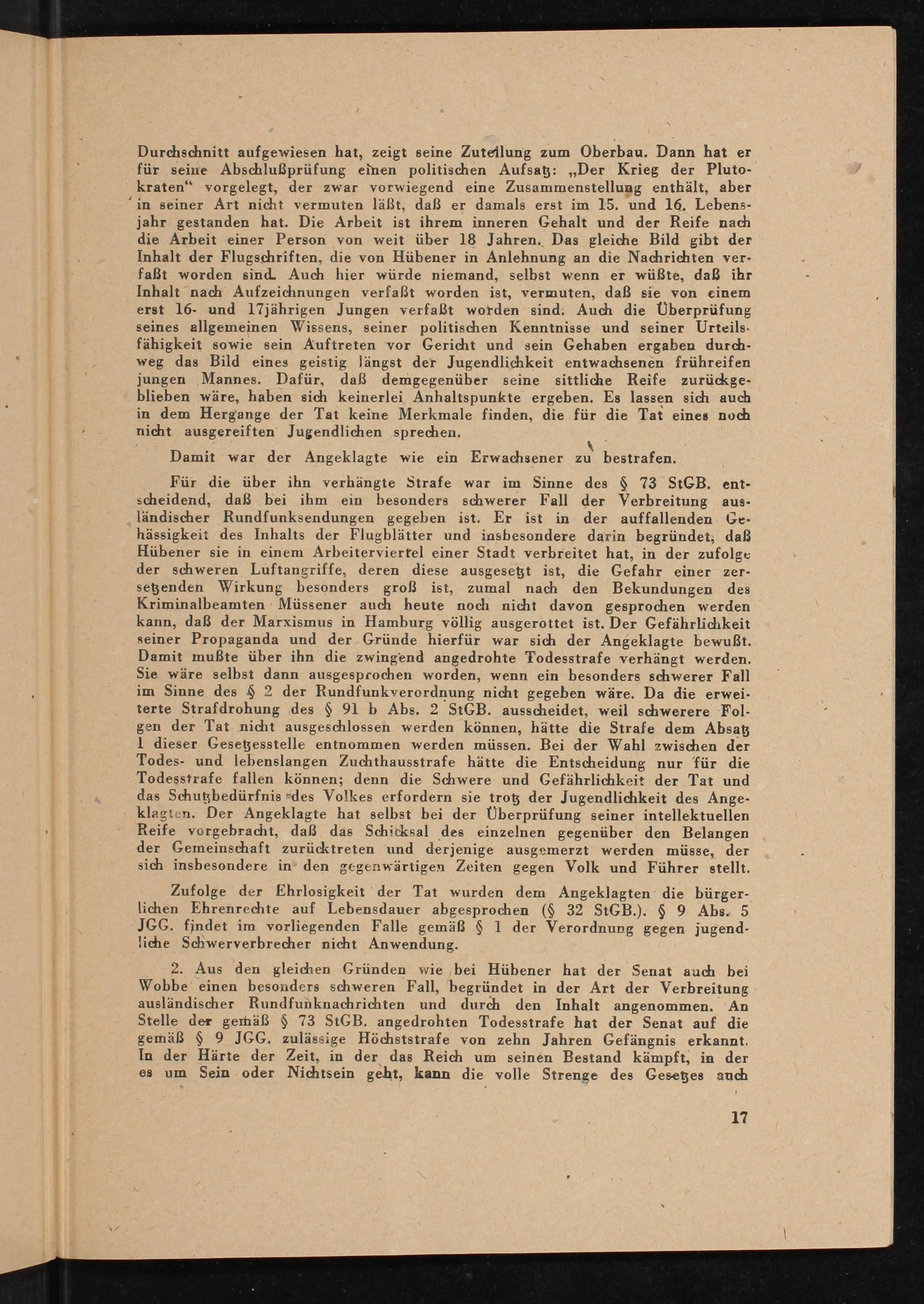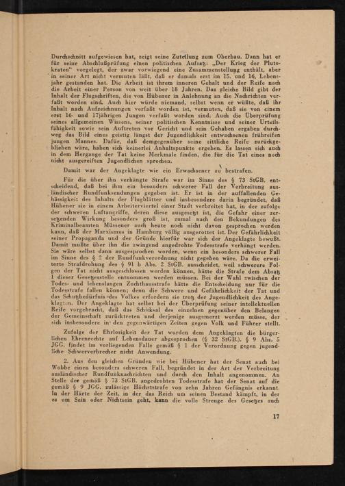 jahr gestanden hat. Die Arbeit ist ihrem inneren Gehalt und der Reife nach die Arbeit einer Person von weit über 18 Jahren. Das gleiche Bild gibt der Inhalt der Flugschriften, die von Hübener in Anlehnung an die Nachrichten ver- faßt worden sind. Auch hier würde niemand, selbst wenn er wüßte, daß ihr Inhalt nach Aufzeichnungen verfaßt worden ist, vermuten, daß sie von einem erst 16- und 17jährigen Jungen verfaßt worden sind. Auch die Überprüfung seines allgemeinen Wissens, seiner politischen Kenntnisse und seiner Urteils. fähigkeit sowie sein Auftreten vor Gericht und sein Gehaben ergaben durch- weg das Bild eines geistig längst der Jugendlichkeit entwachsenen frühreifen jungen Mannes. Dafür, daß demgegenüber seine sittliche Reife zurückge- blieben wäre, haben sich keinerlei Anhaltspunkte ergeben. Es lassen sich auch in dem Hergange der Tat keine Merkmale finden, die für die Tat eines noch nicht ausgereiften Jugendlichen sprechen.