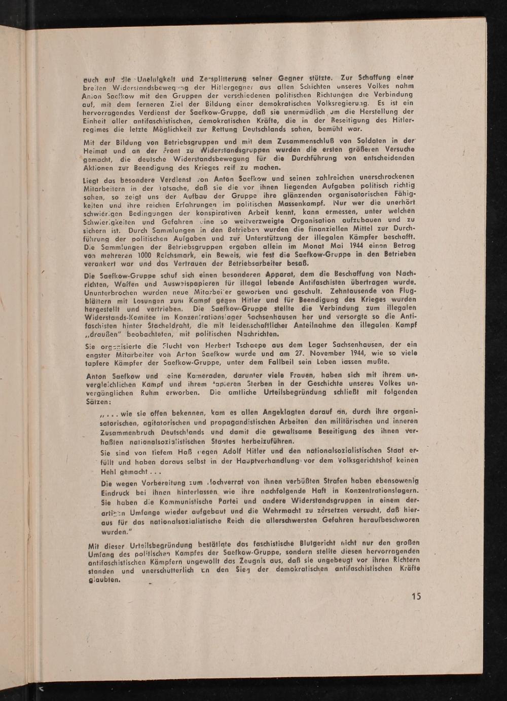 Anton Saefkow und eine Kameraden, darunter viele Frauen, haben sich mit ihrem unvergleichlichen Kampf und ihrem' apieren Sterben in der Geschichte unseres Volkes unvergänglichen Ruhm erworben. Die amtliche Urteilsbegründung schließt mit folgenden Sätzen: