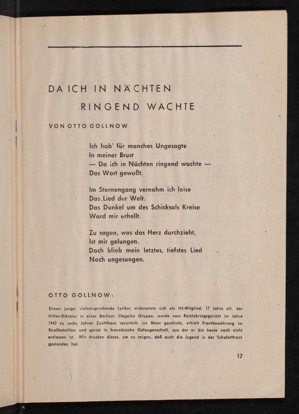 Dieser junge, vielversprechende Lyriker widersetzte sich als HJ -Mitglied, 17 Jahre alt, der Hitler-Diktatur in einer Berliner illegalen Gruppe, wurde vom Reichskriegsgericht im Jahre 1943 zu sechs Jahren Zuchthaus verurteilt, ins Moor geschickt, erhielt Frontbewährung im Strafbataillon und geriet in französische ‚Gefangenschaft, aus der er bis heute noch nicht entlassen ist. Wir drucken dieses, um zu zeigen, daß auch die Jugend in der Schafottfront gestanden hat.