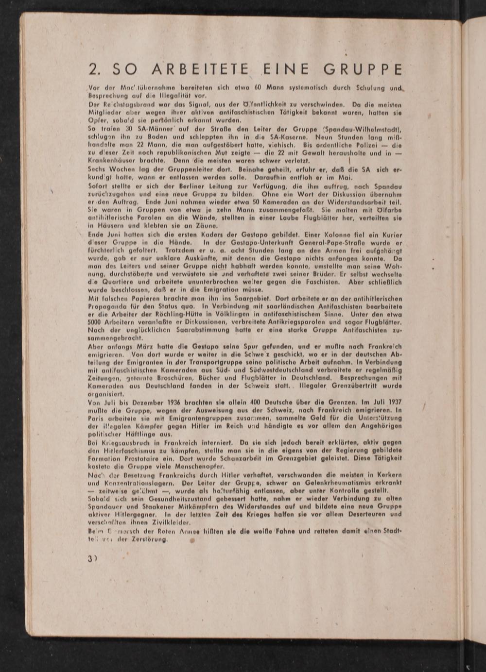 So trafen 30 SA- Männer auf der Straße den Leiter der Gruppe( Spandau - Wilhelmstadt), schlugan ihn zu Boden und schleppten ihn in die SA- Kaserne. Neun Stunden lang miẞ­handelte man 22 Mann, die man aufgestöbert hatte, viehisch. Bis ordentliche Polizei- die zu dieser Zeit noch republikanischen Mut zeigte die 22 mit Gewalt herausholte und in- Krankenhäuser brachte. Denn die meisten waren schwer verletzt.