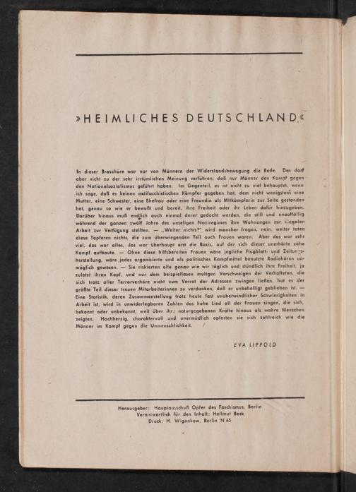 In dieser Broschüre war nur von Männern der Widerstandsbewegung die Rede. Das darf aber nicht zu der sehr irrtümlichen Meinung verführen, daß nur Männer den Kampf gegen den Nationalsozialismus geführt haben. Im Gegenteil, es ist nicht zu viel behauptet, wenn ich sage, daß es keinen antifaschistischen Kämpfer gegeben hat, dem nicht wenigstens eine Mutter, eine Schwester, eine Ehefrau oder eine Freundin als Mitkämpferin zur Seite gestanden hat, genau so wie er bewußt und bereit, ihre Freiheit oder ihr Leben dafür hinzugeben. Darüber hinaus muß endlich auch einmal derer gedacht werden, die still und unauffällig während der ganzen zwölf Jahre des unseligen Naziregimes ihre Wohnungen zur illegalen Arbeit zur Verfügung stellten.- ,, Weiter nichts?" wird mancher fragen, nein, weiter taten diese Tapferen nichts, die zum überwiegenden Teil auch Frauen waren. Aber das war sehr viel, das war alles, das war überhaupt erst die Basis, auf der sich dieser unerhörte zähe Kampf aufbaute. Ohne diese hilfsbereiten Frauen wäre jegliche Flugblatt- und Zeitungsherstellung, wäre jedes organisierte und als politisches Kampfmittel benutzte Radiohören unmöglich gewesen. · Sie riskierten alle genau wie wir täglich und stündlich ihre Freiheit, ja zuletzt ihren Kopf, und nur dem beispiellosen mutigen Verschweigen der Verhafteten, die sich trotz aller Terrorverhöre nicht zum Verrat der Adressen zwingen ließen, hat es der größte Teil dieser treuen Mitarbeiterinnen zu verdanken, daß er unbehelligt geblieben ist.- Eine Statistik, deren Zusammenstellung trotz heute fast unüberwindlicher Schwierigkeiten in Arbeit ist, wird in unwiderlegbaren Zahlen das hohe Lied all der Frauen singen, die sich, bekannt oder unbekannt, weit über ihr naturgegebenen Kräfte hinaus als wahre Menschen zeigten. Hochherzig, charaktervoll und unermüdlich opferten sie sich zahlreich wie die Männer im Kampf gegen die Unnienschlichkeit.