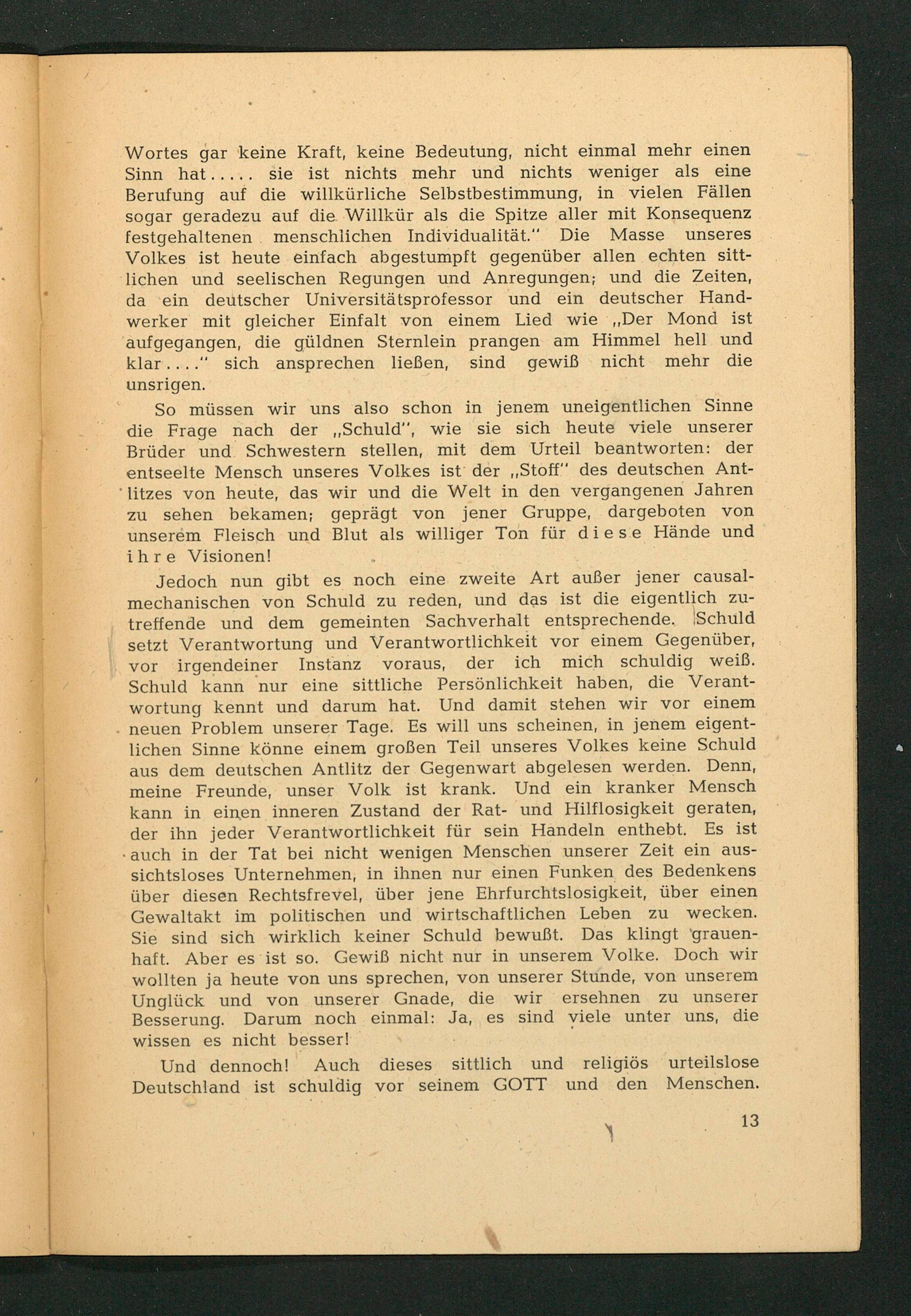 Jedoch nun gibt es noch eine zweite Art außer jener causalmechanischen von Schuld zu reden, und das ist die eigentlich zutreffende und dem gemeinten Sachverhalt entsprechende. Schuld setzt Verantwortung und Verantwortlichkeit vor einem Gegenüber, vor irgendeiner Instanz voraus, der ich mich schuldig weiß. Schuld kann nur eine sittliche Persönlichkeit haben, die Verantwortung kennt und darum hat. Und damit stehen wir vor einem neuen Problem unserer Tage. Es will uns scheinen, in jenem eigentlichen Sinne könne einem großen Teil unseres Volkes keine Schuld aus dem deutschen Antlitz der Gegenwart abgelesen werden. Denn, meine Freunde, unser Volk ist krank. Und ein kranker Mensch kann in einen inneren Zustand der Rat- und Hilflosigkeit geraten, der ihn jeder Verantwortlichkeit für sein Handeln enthebt. Es ist auch in der Tat bei nicht wenigen Menschen unserer Zeit ein aussichtsloses Unternehmen, in ihnen nur einen Funken des Bedenkens über diesen Rechtsfrevel, über jene Ehrfurchtslosigkeit, über einen wecken. Gewaltakt im politischen und wirtschaftlichen Leben zu Sie sind sich wirklich keiner Schuld bewußt. Das klingt grauenhaft. Aber es ist so. Gewiß nicht nur in unserem Volke. Doch wir wollten ja heute von uns sprechen, von unserer Stunde, von unserem zu unserer Gnade, die wir ersehnen Unglück und von Besserung. Darum noch einmal: Ja, es sind viele unter uns, die wissen es nicht besser!